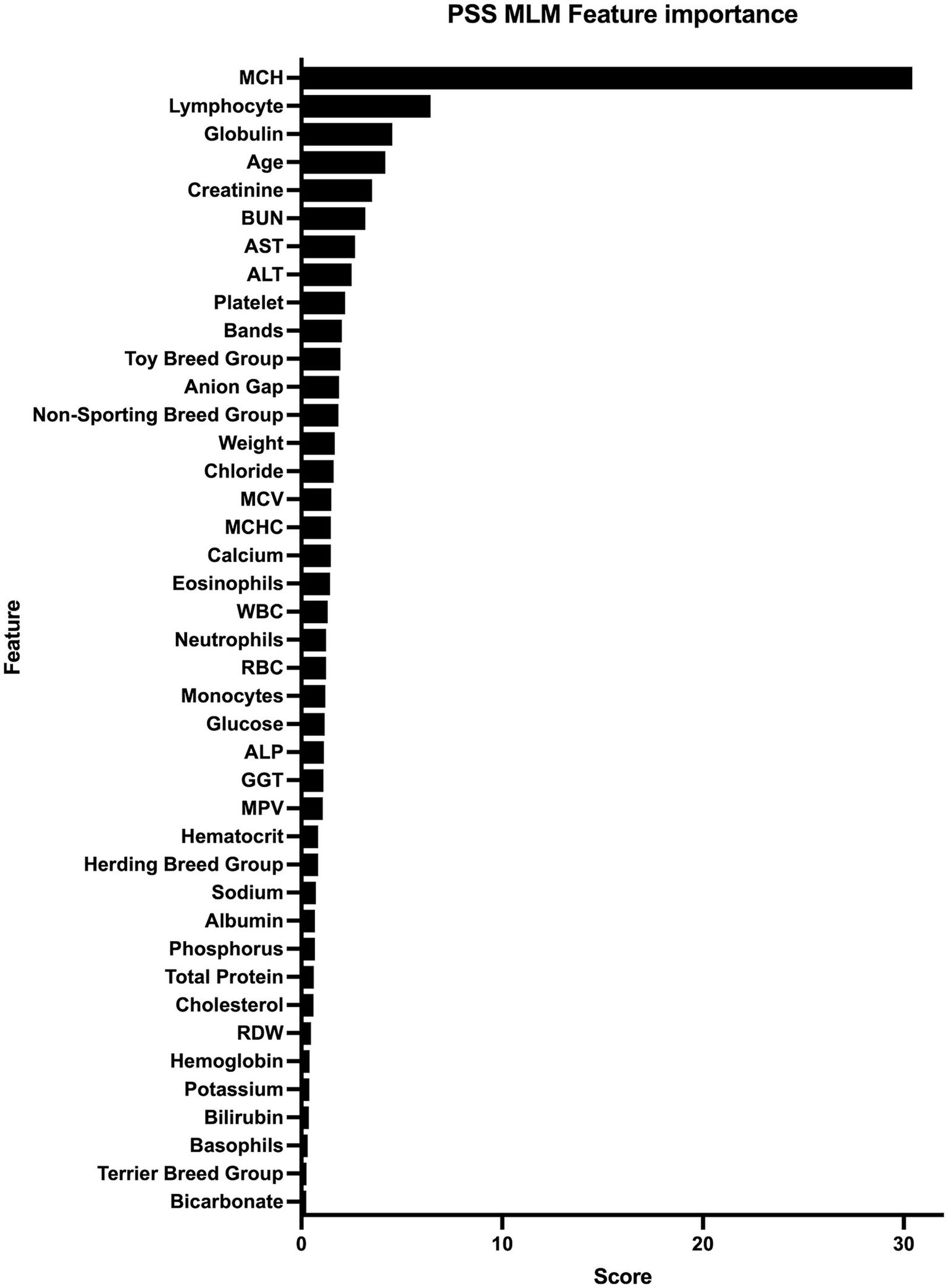 Feature importance in the PSS MLM was assessed using the gain metric. Features with a high score were considered to have higher gain and, therefore, more impact on the MLM prediction.