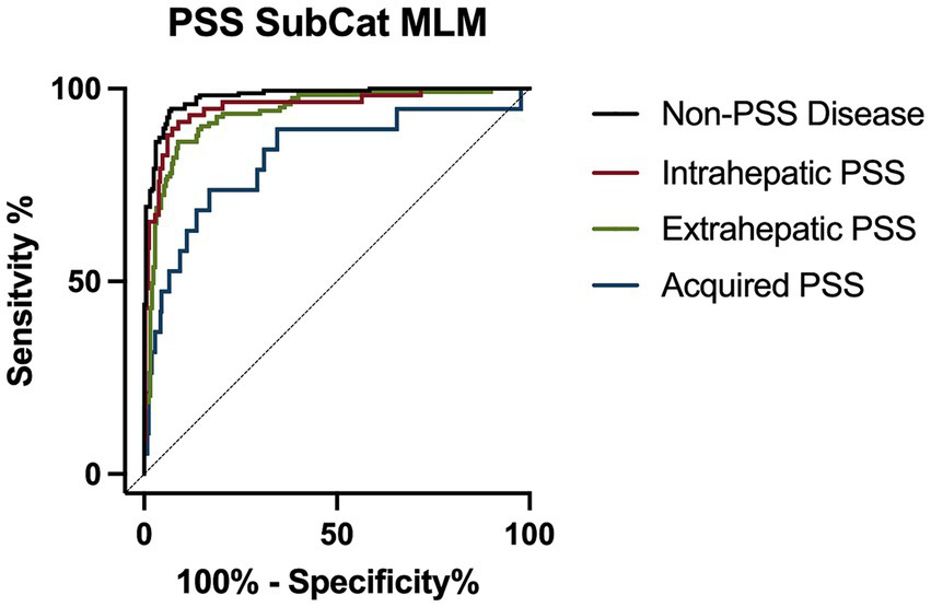 Classification models were trained with patient features and clinicopathologic parameters (Table 1). The data set was randomly split into a 70% training set and a 30% test set and two models were trained, one that predicts the presence of any PSS (PSS MLM) and a second that predicts the subclassification of PSS (PSS SubCat MLM). First, a gradient boosted tree (xgboost 1.7.6, Python3) was trained to discriminate between PSS and non-PSS dogs (PSS MLM) (21). The model was trained using 10-fold cross-validation, and hyperparameters were tuned using a Bayesian search algorithm optimized based on AUC-ROC. The tuned hyperparameters included gamma, learning rate, maximum depth, the number of estimators, regularization alpha, and regularization lambda (Supplementary Table S1). A second gradient boosted tree (PSS SubCat MLM) was trained to classify animals into the following categories: single intrahepatic portosystemic shunt, single extrahepatic portosystemic shunt, multiple extrahepatic shunts, or non-PSS disease. Due to class imbalance, the synthetic minority over-sampling technique (SMOTE) from imblearn (0.10.1) library was applied to the PSS SubCat MLM training data set (22, 23). Model code utilized to build these models is publicly available (https://github.com/MakanFar/pss_classification).