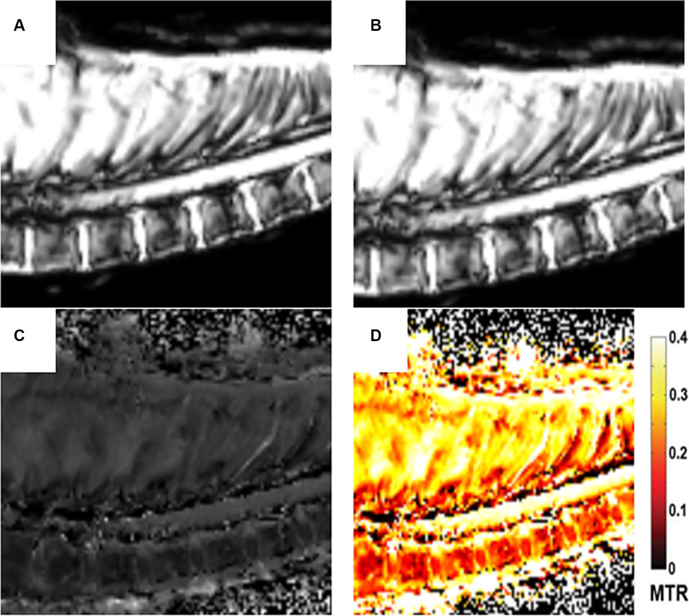 Different sets of images of the MTR sequence: Image without the off-resonance RF with the signal M0 (A). Image with the off-resonance saturation RF with the signal MSAT (B), Image calculated with the MTR pixel-by-pixel algorithm (MTR = (M0-MSAT)/M0) (C). Image of the MTR color map (D).