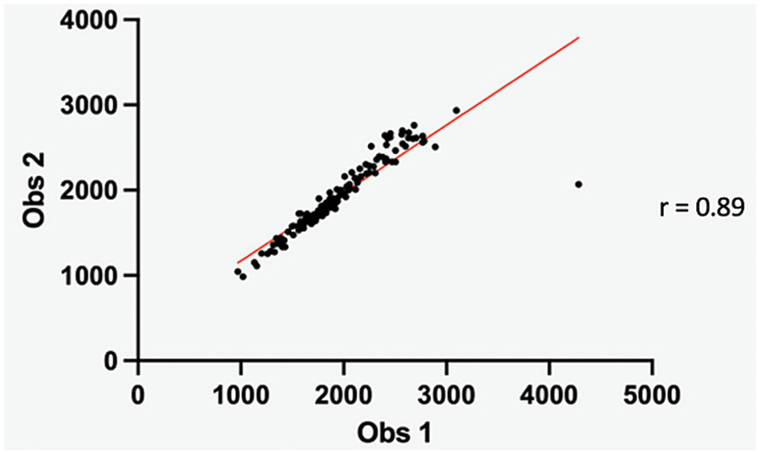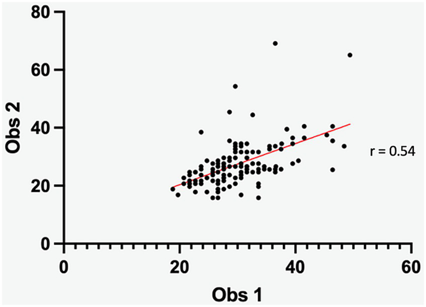 Scatter diagram depicting the delineation of IVD ROI between observers. The Pearson correlation coefficient (0.54) indicates a fair inter-observer difference.