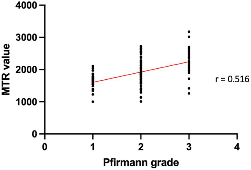 The Spearman correlation showed a significant positive moderate correlation (rho = 0.516; p < 0.001) between the Pfirrmann grades and the MTR values of the IVD (Figure 5).