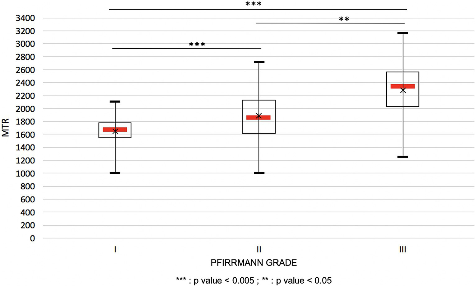 Variation of the MTR values in function of the Pfirrmann grading represented in plot boxes. The black cross represents the average of MTR within one Pfirrmann grade.