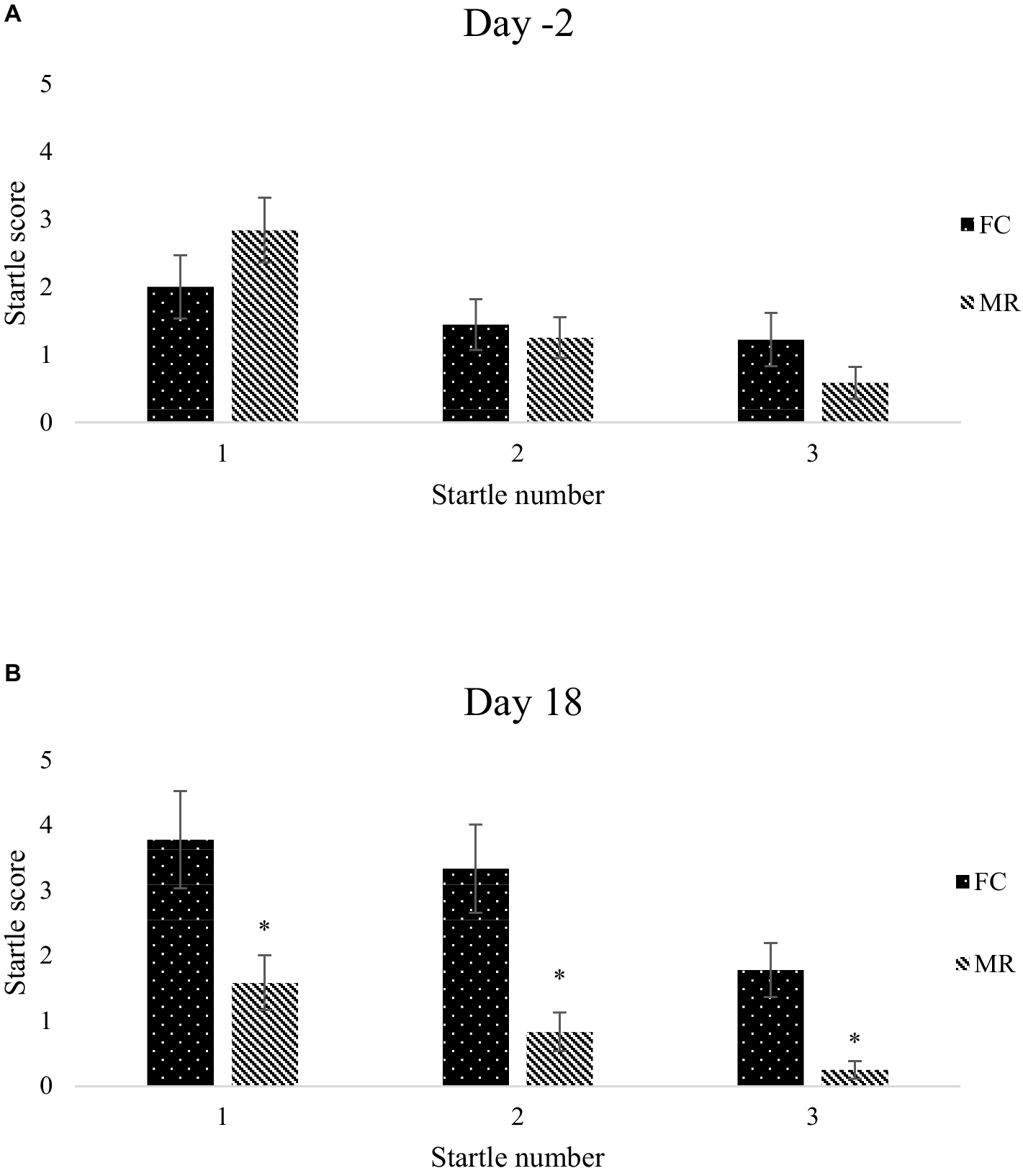 The startle response of 9 FC and 12 MR sows to a loud, unexpected stimulus, a metal pipe hitting a solid metal gate placed in the middle of the test zone, was recorded on days −2 and 18 relative to farrowing. On each test day, the sound stimulus was played three times (labelled startle 1–3) at 3-min intervals. The magnitude of the startle response displayed by each sow was scored using the 6-point scale developed by Doyle et al. (27) with 0, no response; 1, ears move; 2, head moves and no freeze; 3, head moves and short freeze (≤5 s); 4, head moves and long freeze (>5 s); 5, flinch and freeze (body changes position).