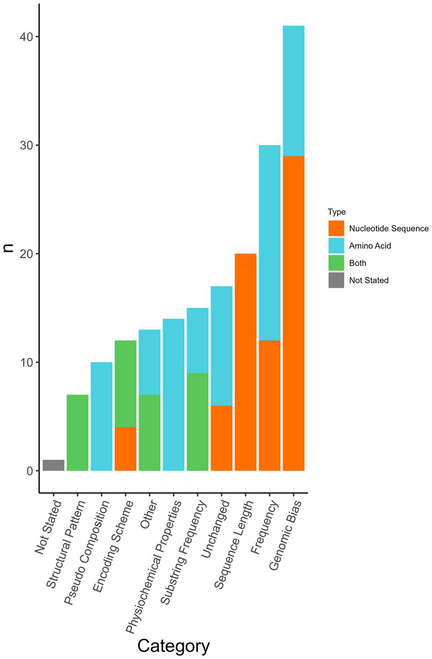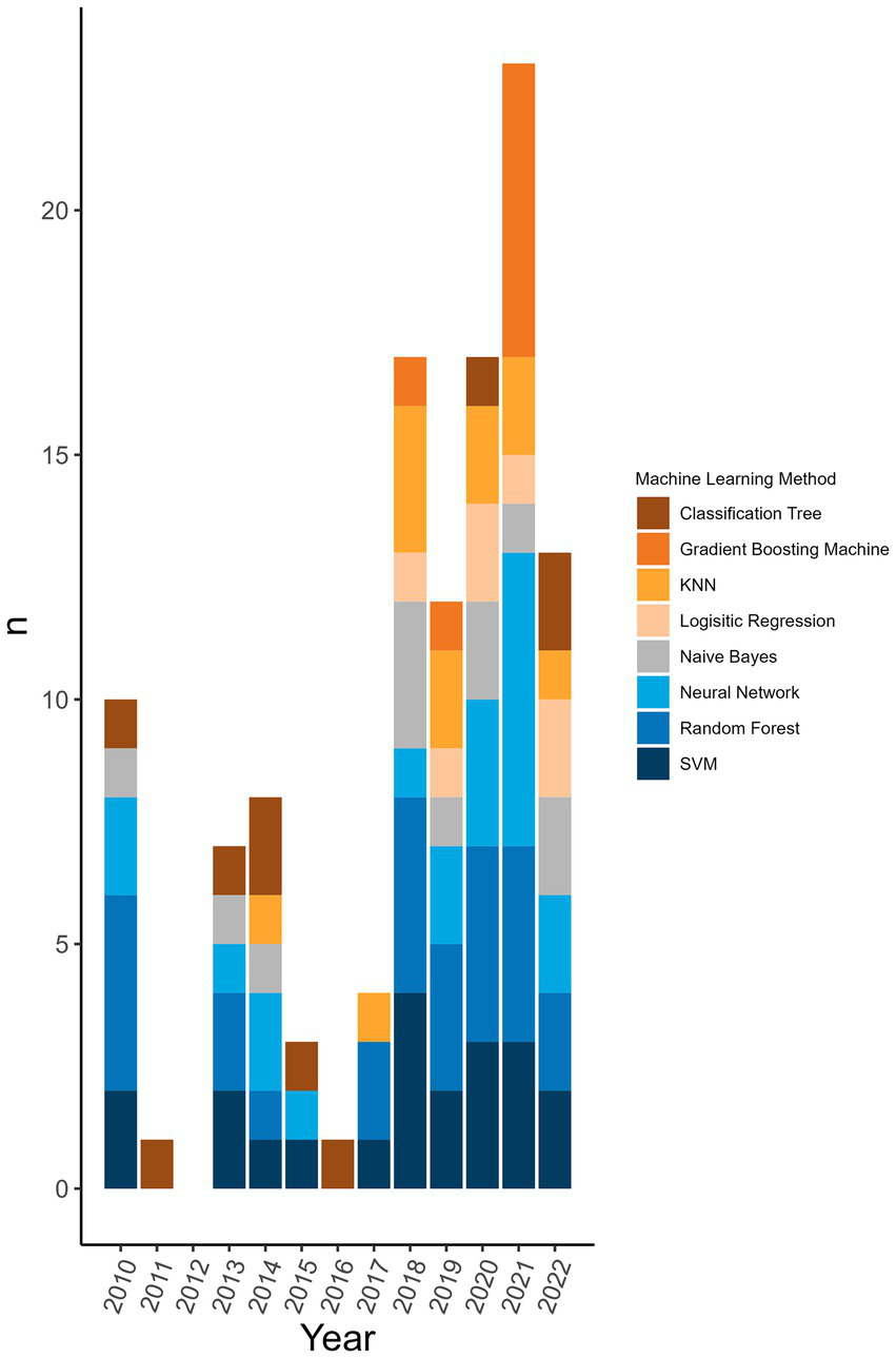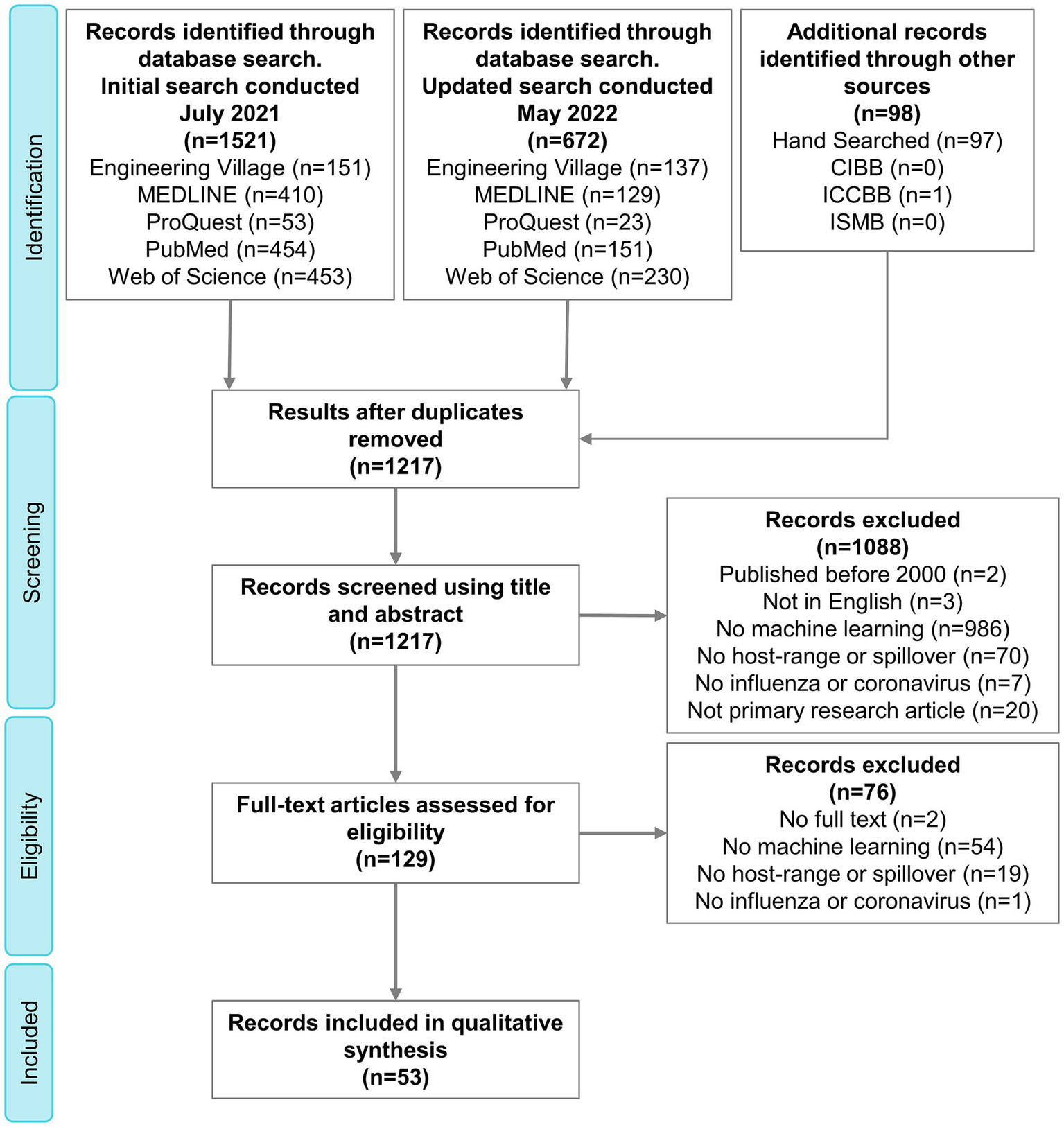 Fifty-three relevant publications were identified for data charting. The breadth of research was extensive including 32 different machine learning algorithms used in combination with 29 different feature selection methods and 43 different genome data input formats. There were 20 different methods used by authors to assess accuracy. Authors mostly used influenza viruses (n = 31/53 publications, 58.5%), however, more recent publications focused on coronaviruses and other viruses in combination with influenza viruses (n = 22/53, 41.5%). The susceptible animal groups authors most used were humans (n = 57/77 analyses, 74.0%), avian (n = 35/77 45.4%), and swine (n = 28/77, 36.4%). In total, 53 different hosts were used and, in most publications, data from multiple hosts was used.