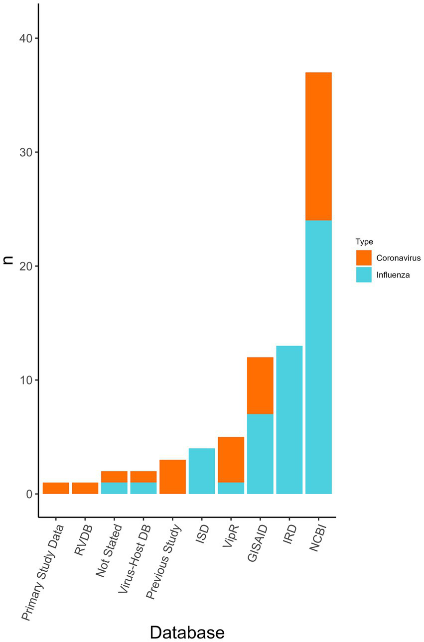 The goal of this scoping review was to address the research question: “What machine learning methods have been applied to influenza virus and coronavirus genome data for identification of potential reservoirs?” The body of evidence was characterized by types of viruses, genome types, types of analyses and machine learning classifiers applied.