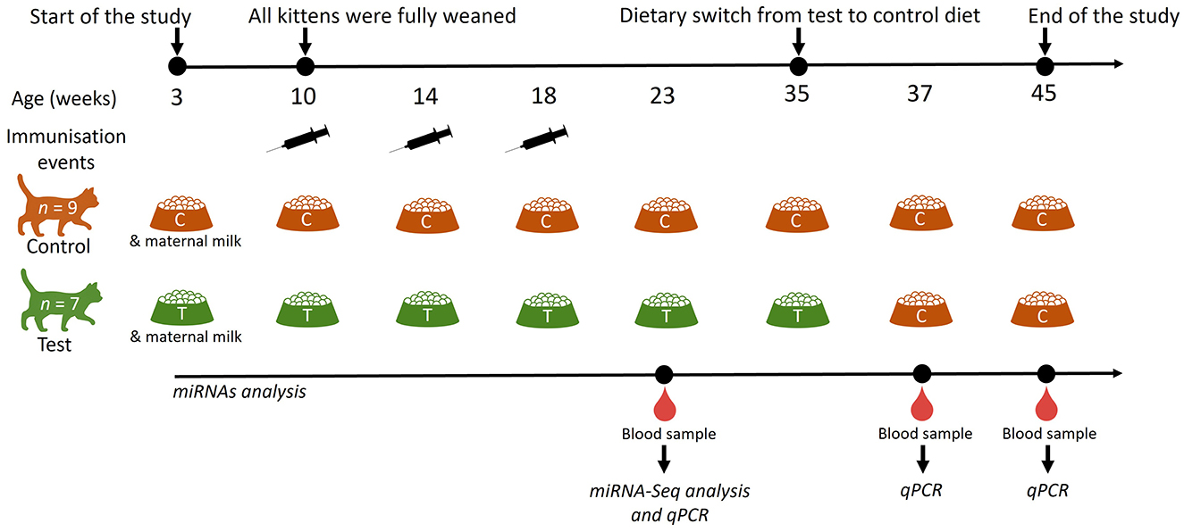 Figure 1. Schematic representation of the study design to determine the effects of dietary nucleotides and oligosaccharides on the expression of circulating miRNAs. Kittens were fed a control (C; n = 9) or a test (T; n = 7) diet from 3 weeks of age; all kittens were fully weaned at 10 weeks of age. miRNA analysis was performed at 23-, 37- and 45-weeks of age. The test diet group was moved onto a control diet at 35 weeks of age. Cats were vaccinated with Fevaxyn® Pentofel vaccine at 10, 14 and 18 weeks of age.