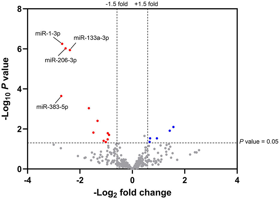 Figure 2. Volcano plot illustrating the magnitude fold change and statistical differences of plasma miRNAs from 23-week-old kittens fed with the test diet compared to control. The magnitude fold change (–Log2) is plotted on the x-axis and the significance (t-test; -Log10P value) is plotted on the y-axis. Fold change > 1.5 and P-value < 0.05 were set as the thresholds for identifying significantly differentially expressed plasma miRNAs from 23-week-old kittens fed with the test diet (n = 7) compared to the control group (n = 9). The red and blue hits represent the downregulated (