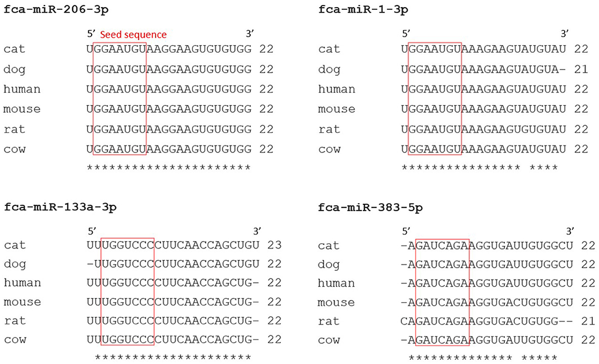 Figure 3. Nucleotide sequences of feline miRNAs with false discovery rate (FDR) <0.05 were well conserved across mammalian species. Nucleotides sequences of feline (felis catus; fca) miRNAs of interest obtained from miRNA-sequencing analysis, with FDR <0.05, were aligned (Clustal Omega) with sequences of miRNAs from other species (miRBase). A red box was drawn around miRNA seed regions and similarities between nucleotides across different species were marked with a star (*).