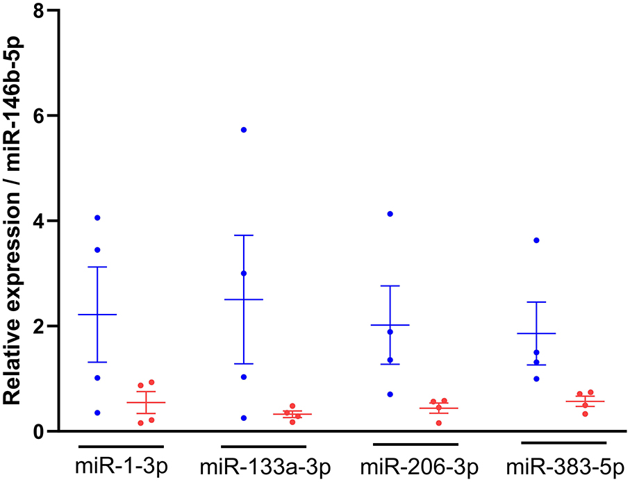 RT-qPCR analysis was first performed to identify the most stably expressed miRNA amongst candidate endogenous (let-7c-5p, miR-99a-5p, miR-146b-5p and miR-140-3p) and exogenous (cel-miR-2-3p and cel-miR-39-3p) miRNAs to be used as reference genes for normalisation. As a result, miRNA-146b-5p was selected as normaliser, because it showed a low variability (CV = 1.06%) across all candidate normalisers, did not cluster between diets (Supplementary Figure 2) and had a low stability value (0.005). The relative expression of miR-383-5p, miR-1-3p, miR-133a-3p and miR-206-3p in plasma from 23-week-old kittens (n = 4 per diet group) was lower in kittens fed with the test diet compared to the control group, and while their expression was more variable in the control group, the opposite was observed in kittens fed with the test diet (Figure 4).