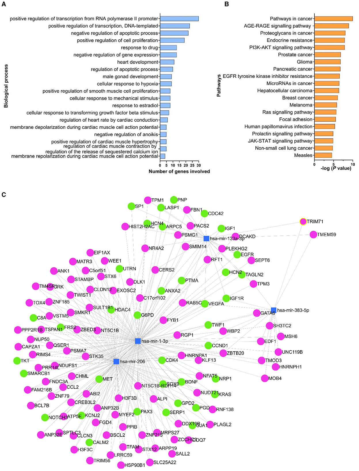 Figure 5. Biological processes, pathways and genes targeted by the miRNAs of interest. The list of experimentally validated genes (identified in miRTarBase) targeted by the miRNAs of interest was used in the DAVID database to determine the biological processes (A) and the pathways (B) affected by the miRNAs of interest. Only the top-20 statistically significant processes with the lowest P-values were reported in (A) and (B). Human (hsa)-miR-1-3p, hsa-miR-133a-3p, hsa-miR-206-3p and hsa-miR-383-5p were used to create a network map of the miRNAs of interest (blue squares) using miRNet platform (C). The target genes reported on miRTarBase as being experimentally validated by reporter assay, western blot and qPCR assay were shown in green circles; all the other genes were reported in magenta.