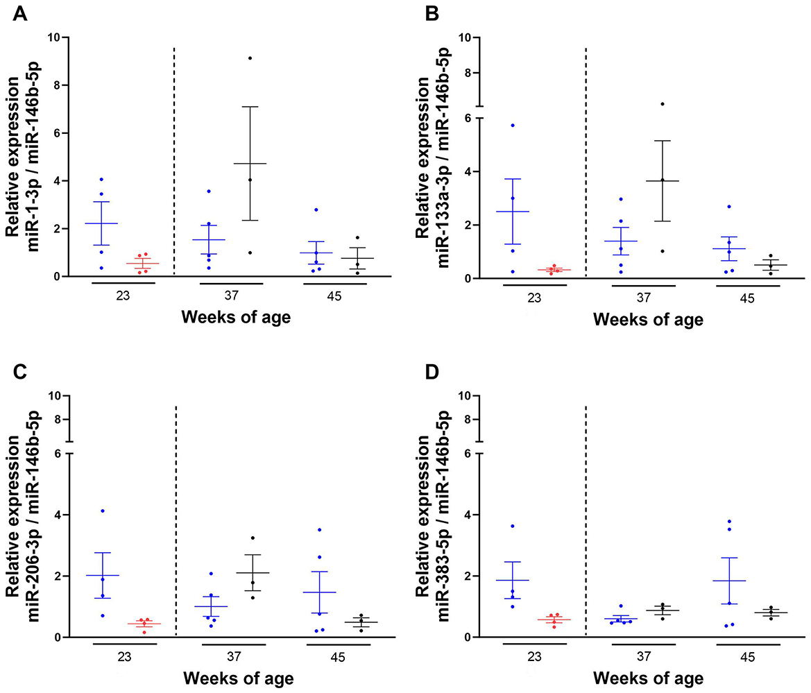 and (blood) sampled at 37 (n = 3) and 45 (n = 3) weeks of age (T-C). RNA was isolated from plasma of kittens, miRNA-specific cDNAs were synthesised and TaqMan qPCR performed. Ct values obtained for each miRNA were normalised to the averaged Ct value of miR-146b-5p and the 2−ΔΔCt method was used to assess the relative expression of miR-1-3p (A), miR-133a-3p (B), miR-206-3p (C) and miR-383-5p (D). Final data shown as mean ± SEM (n = 6 independent experiments). Unpaired t-test between diets at each week of age. One-way ANOVA and Dunnett's multiple comparisons test vs. 23 weeks of age between control and C-C kittens. Mixed-effects analysis and Dunnett's multiple comparisons test vs. 23 weeks of age between test and T-C groups.