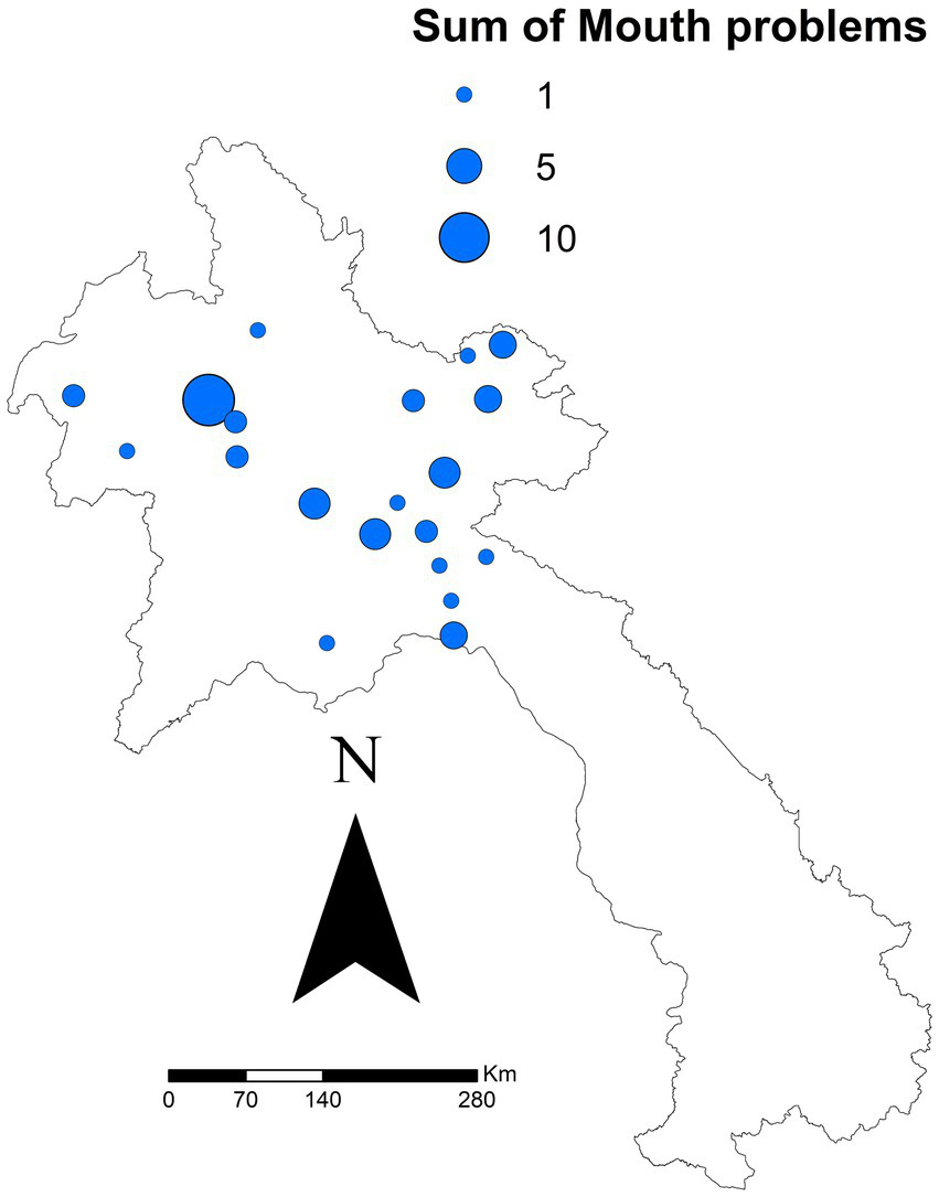Sum of ‘mouth problems’ reported by 43 district in 10 northern Laos provinces in a study of FMD in cattle and buffalo from November 2021 to December 2022. Data was reported via the National Animal Disease Reporting System.