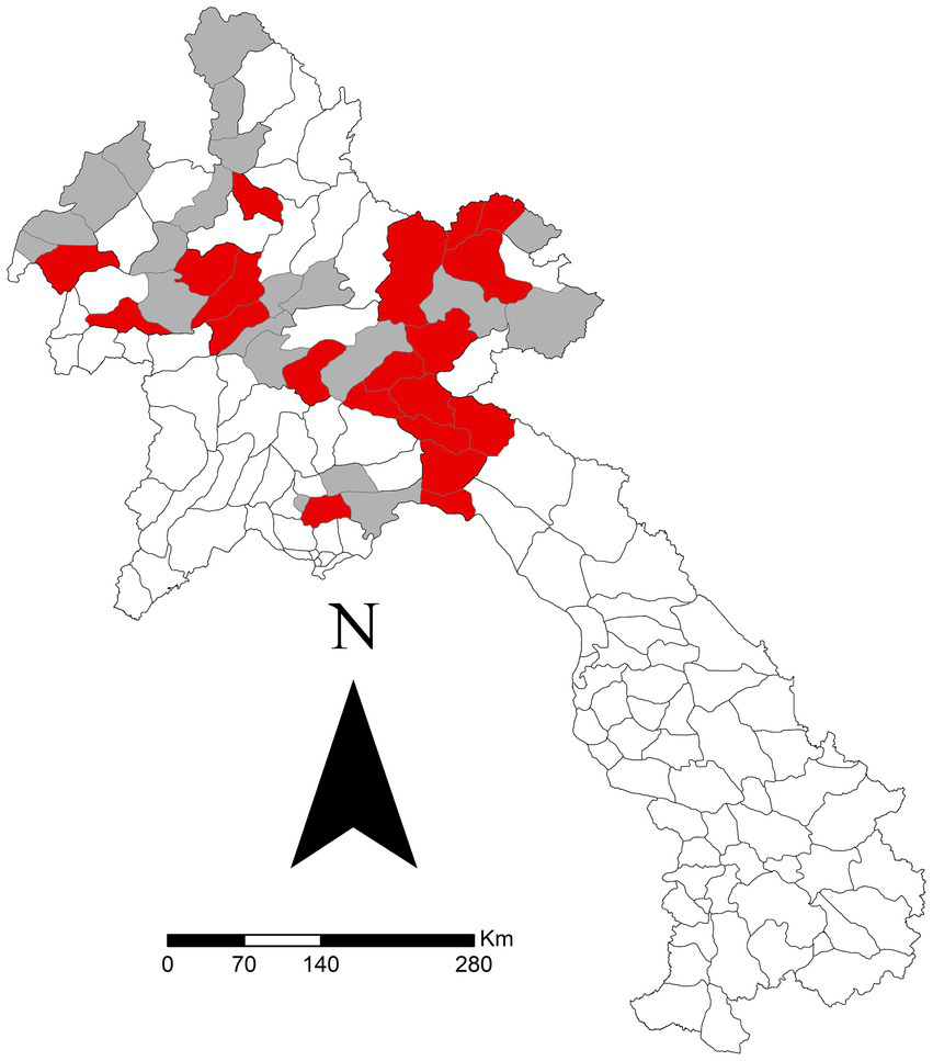 Districts reporting ‘mouth problems’ (red) versus those not reporting (grey) in a study of FMD in cattle and buffalo in 43 districts in 10 northern Laos provinces from November 2021 to December 2022. Data was reported via the National Animal Disease Reporting System.