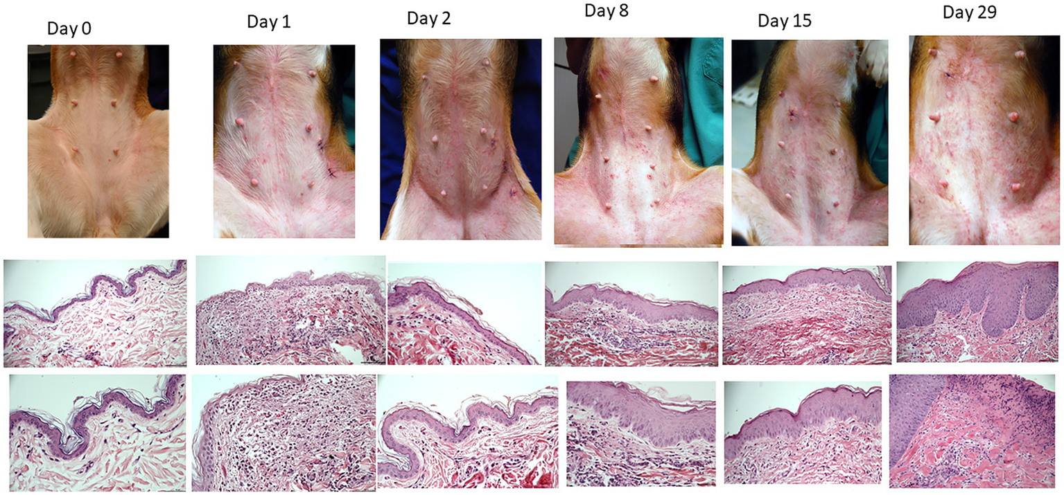 All dogs flared with pruritus and dermatitis after HDM exposure. The severity of dermatitis reached a plateau after 1 week of HDM exposure (Supplementary Figure S1). Examples of clinical lesions and histopathology findings are shown in Figure 2. The most common lesions were erythematous macules and papules. Biopsies showed a progressive increase in superficial perivascular to diffuse mononuclear and eosinophilic dermatitis and epidermal hyperplasia over the course of exposures (Figure 2). Histology scores progressively increased over time (Supplementary Figure S2).