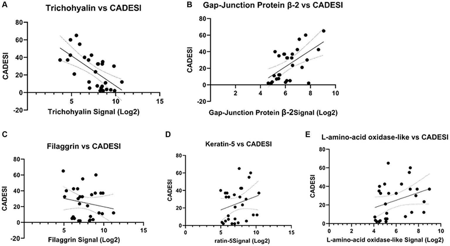 Correlations between selected genes and dermatitis scores (CADESI). (A) A statistically significant negative correlation existed between CADESI and trichohyalin gene expression (p = 0.00025, r = −0.68). (B) A statistically significant positive correlation between gap-junction protein and CADESI (r = 0.59; p = 0.00093) was observed. No other significant correlations were found (C–E).