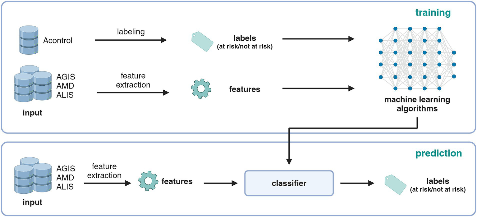 The development process of the risk index and the data sources involved are shown in Figure 1. Data from four individual databases were interconnected: Acontrol, AGIS, AMD, and ALIS. Data from previous on-farm welfare inspections in Acontrol were used as labels to calibrate a binary welfare index (at risk/not at risk). The features used for prediction (i.e., proxy variables) were extracted from the three other databases AGIS, AMD, and ALIS. Four different machine learning algorithms were applied and compared. In the following, the individual steps and databases are explained in detail: (i) data sources, (ii) labels and features, and (iii) classification algorithms.