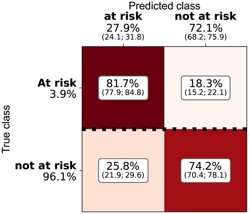 Based on historical results from on-farm inspections recorded in the Acontrol database, a scalar metric was built. According to the Swiss Animal Welfare Act and Ordinances, the welfare status was thus defined as the compliance/violations of control points (39–41). All control points were treated equally, and the various sub-points (e.g., lameness, body condition) were not labelled individually. Follow-up control visits were disregarded due to previous violations. A weighting scheme was applied to diminish the weight of announced inspections (factor of 0.8) compared with unannounced inspections (factor of 1). Moreover, if more than one inspection occurred during the selected time window, the importance of older inspections was also reduced by an exponential weighting scheme. Finally, the label for the risk index is a binary value depending on the fraction of inspections with registered violations over the total number of (relevant) controls. For a holding to be considered “at risk,” this proxy should be greater than or equal to 0.5.