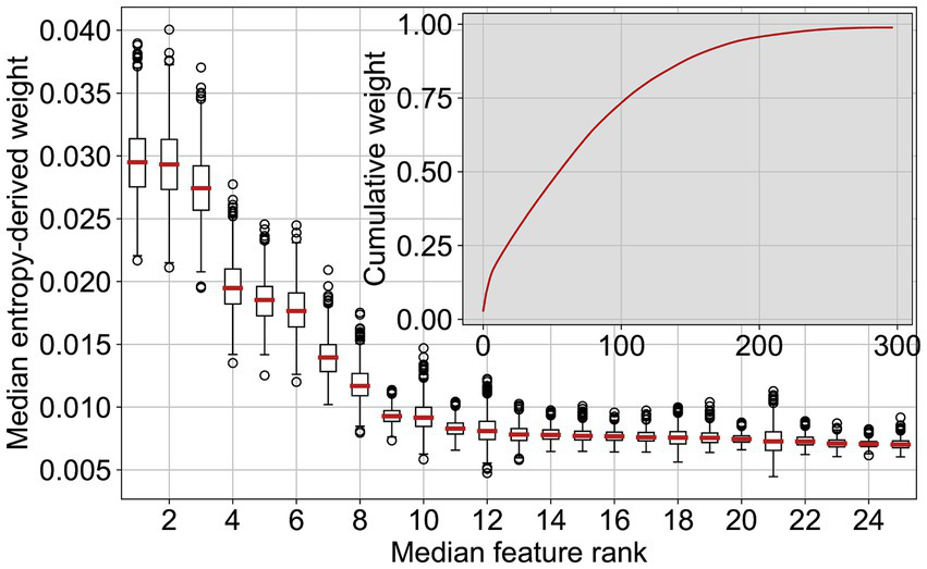 Figure 7. The 25 most important features for the random forest cattle classifier, sorted by their median importance weight and the cumulative feature weight.