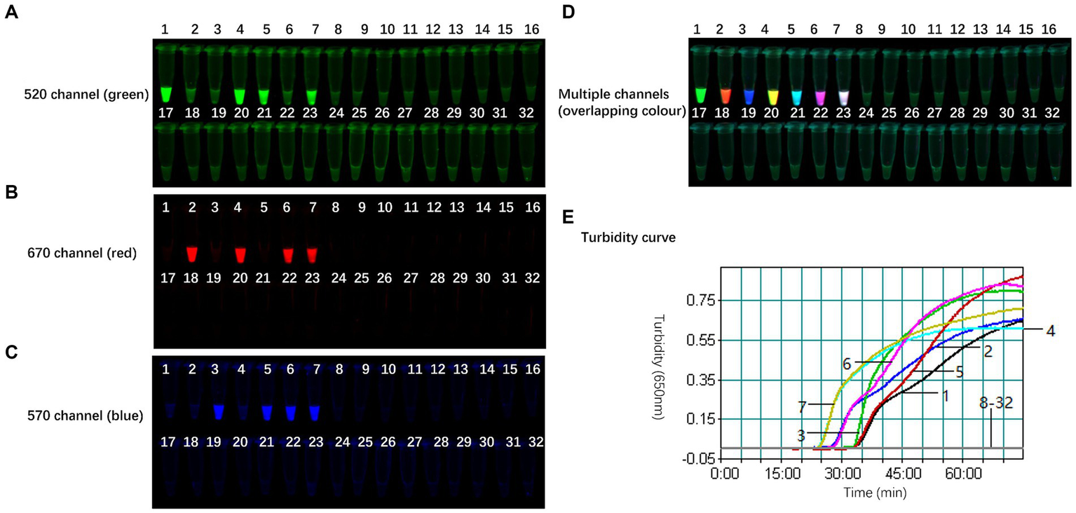 Figure 5. Specificity of the TLAMP assay. The fluorescent TLAMP products were imaged separately using (A) the 520 nm channel, (B) 670 nm channel, (C) 570 nm channel and (D) multiple channels, and (E) the turbidity curve was monitored with a real-time turbidimeter. 1: H5; 2: H7; 3: H9; 4: H5 + H7; 5: H5 + H9; 6: H7 + H9; 7: H5 + H7 + H9; 8: H1; 9: H2; 10: H3; 11: H4; 12: H6; 13: H8; 14: H10; 15: H11; 16: H12; 17: H13: 18: H14; 19: H15; 20: H16; 21: NDV; 22: IBV; 23: ARV; 24: ILTV; 25: CIAV; 26: FAdV-4; 27: ChPV; 28: MDV; and 29–32: negative control.