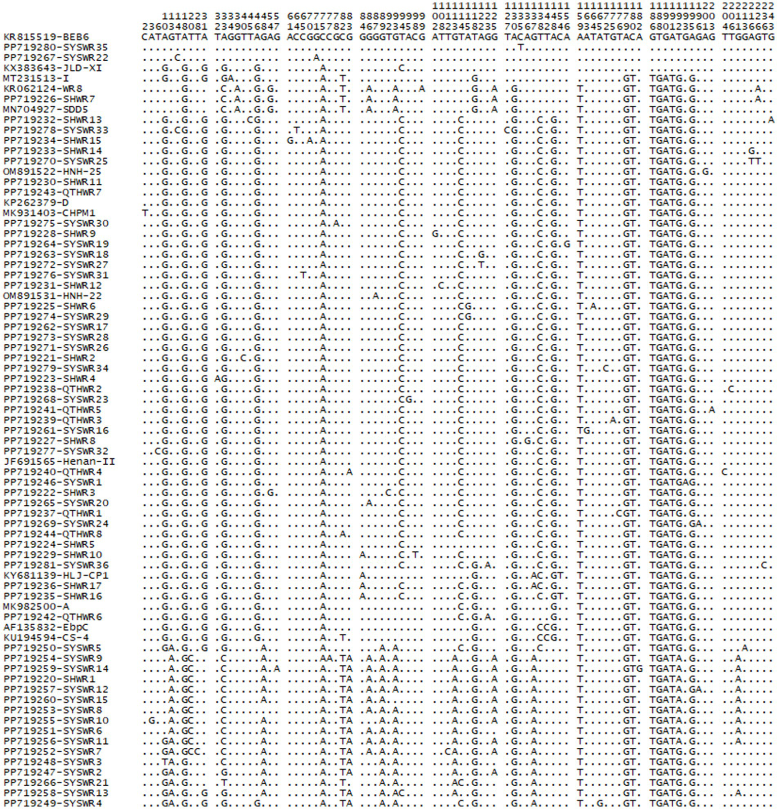 | SYSWR13 (PP719258) | WR7/ A to G (10), G to A (13), A to G (19), A to G (31), C to G (33), A to G (85), T to C (93), A to G (124), A to G (191) |