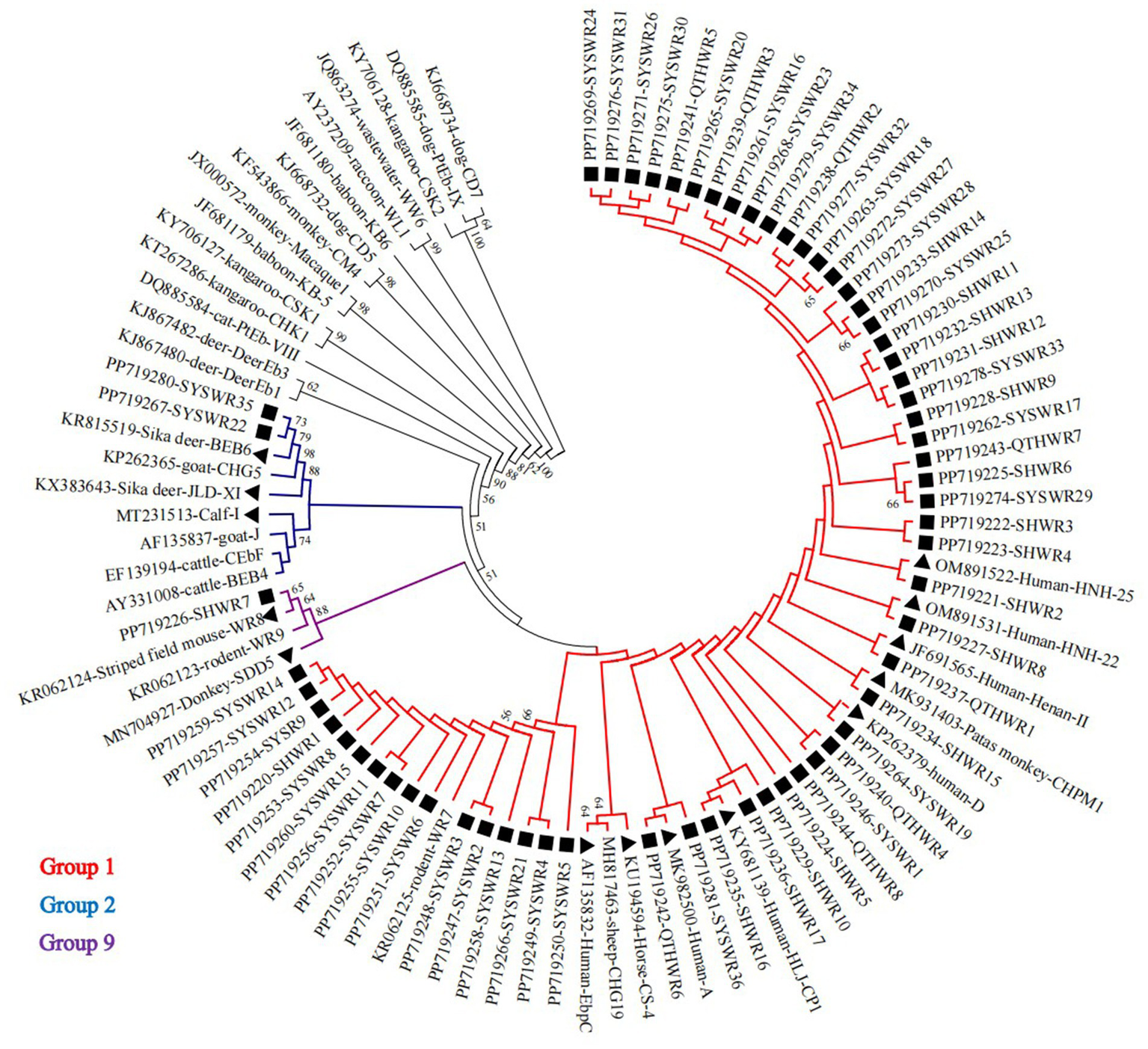 Among the 817 R. norvegicus, the total infection rate was 33.3% (272/817). Seventy-five genotypes were identified, including 14 known genotypes D (n = 167), A (n = 15), HLJ-CP1 (n = 12), WR8 (n = 6), EbpC (n = 2), BEB6 (n = 1), CS-4 (n = 1), CHPM1 (n = 1), Henan-II (n = 1), HNH-22 (n = 1), HNH-25 (n = 1), I (n = 1), JLD-XI (n = 1), SDD5 (n = 1), and 61 novel genotypes designated as SHWR1 (n = 10), SYSWR1 (n = 2), and SHWR2 to SHWR17, SYSWR2 to SYSWR36 and QTHWR1 to QTHWR8 (n = 1, each). Moreover, 10 samples exhibited mixed genotype infections, including D + A (n = 3), D + EbpC (n = 1), D + HLJ-CP1 (n = 1), D + SHWR1 (n = 1), D + SHWR16 (n = 1), D + SHWR17 (n = 1), SDD5 + WR8 (n = 1), and CS-4 + SYSWR36 (n = 1). Phylogenetic analysis grouped the genotypes into three main groups: group 1 (n = 67), group 2 (n = 5), and group 9 (n = 3).