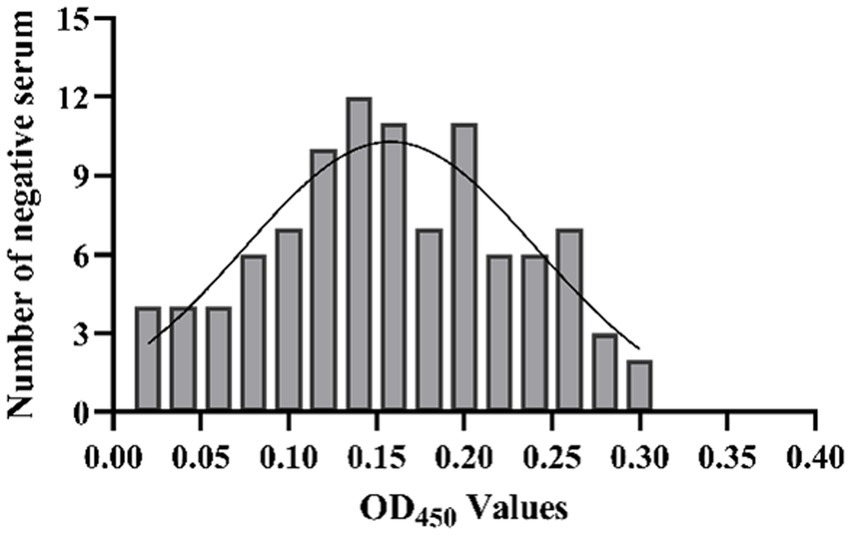 The results showed that the data had a normal distribution based on the Shapiro–Wilk (S-W test:0.174 > 0.05) and Kolmogorov-Smirnova (Sig value: 0.200 > 0.05; Figure 2). The calculated mean () and standard deviation (SD) of OD450 are 0.157 and 0.077, and the value of +2 × SD and +3 × SD are 0.312 and 0.389, respectively. The positive of BATV antibody is indicated by an OD450 ≥ 0.389, a negative result by an OD450 ≤ 0.312, and a suspicious result by an OD450 between 0.312–0.389. The repeatability test showed that the coefficients of variation less than 10% (0.53–7.97%,2.07–9.68%; Figure 3). When the dilution of positive serum was 1:1600, the OD450 was greater than 0.389, with high sensitivity (Figure 4). The OD450 values for oat pox virus and brucella positive serum were 0.245 and 0.289, respectively, while the OD450 value for BATV positive serum was 1.259. This shows that the antigen did not react with goat pox virus or Brucella positive serum, indicating good specificity.