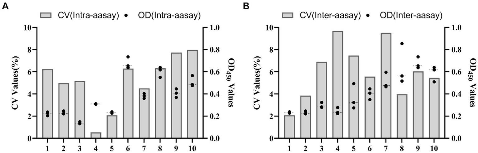 Reproducibility test (A) In-lot coefficient. (B) Interlot coefficient.