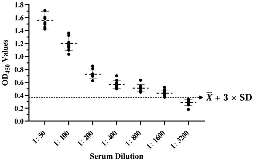 The recombinant protein (2.5 μg/mL) was used to coat a 96-well microtiter plate overnight at 4°C and then washed three times in 1× ELISA Washing Buffer (Sangon Biotech Co., Ltd., China) for 5 min per wash according to the manufacturer’s instructions. Next, blocking was performed using Blocking Buffer (Sangon Biotech) at 37°C for 1 h, followed by three washes for 5 min per wash. The serum samples and horseradish peroxidase-conjugated secondary antibody (HRP-conjugated Rabbit anti-Goat IgG, HRP-conjugated Goat anti-Bovine IgG, Sangon Biotech) were diluted with General Antibody Dilution Buffer (Sangon Biotech) at a ratio of 1:60 and 1:10,000, respectively. A blank control and positive control were also included. The serum samples were added to each well and incubated at 37°C for 1 h, followed by three washes of 5 min each. The same method is used for secondary antibody. ELISA Color Solution (Sangon Biotech) was added and incubated at 37°C. After 15 min, ELISA Stopping Solution (Sangon Biotech) was added to halt color development. Finally, the optical density was read at 450 nm. The mean value () and standard deviation (SD) of 100 BATV-negative samples were calculated and used to determine the threshold values. Results ≤ + 2 × SD were considered negative, and results ≥ + 3 × SD were considered positive. Results falling between these two parameters were considered suspicious.