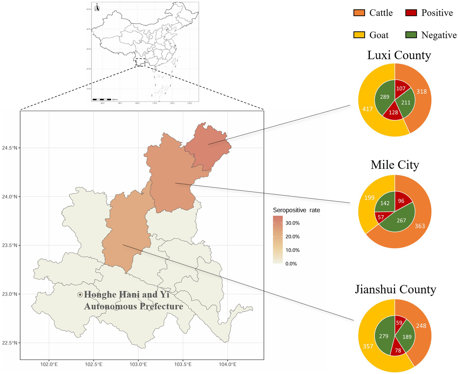 From 2021 to 2022, a total of 929 cattle and 973 goat serum samples were collected from Jianshui County (23°38′5.96″N,102°49′37.16″E), Mile City (24°24′38.12″N,103°24′53.96″E), and Luxi County (24°31′55.56″ N,103°45′58.43″E) in Honghe Prefecture, Yunnan Province. Samples were collected from various populations in three regions, with 11 cattle farms in one region, 28 in another, and 17 in the third. The respective number of goat farms in each region is 23, 24, and 13. The blood samples were collected from healthy cattle and goats, centrifuged to obtain serum, classified by region, type, and collection date, and refrigerated for future analysis after aliquoting.