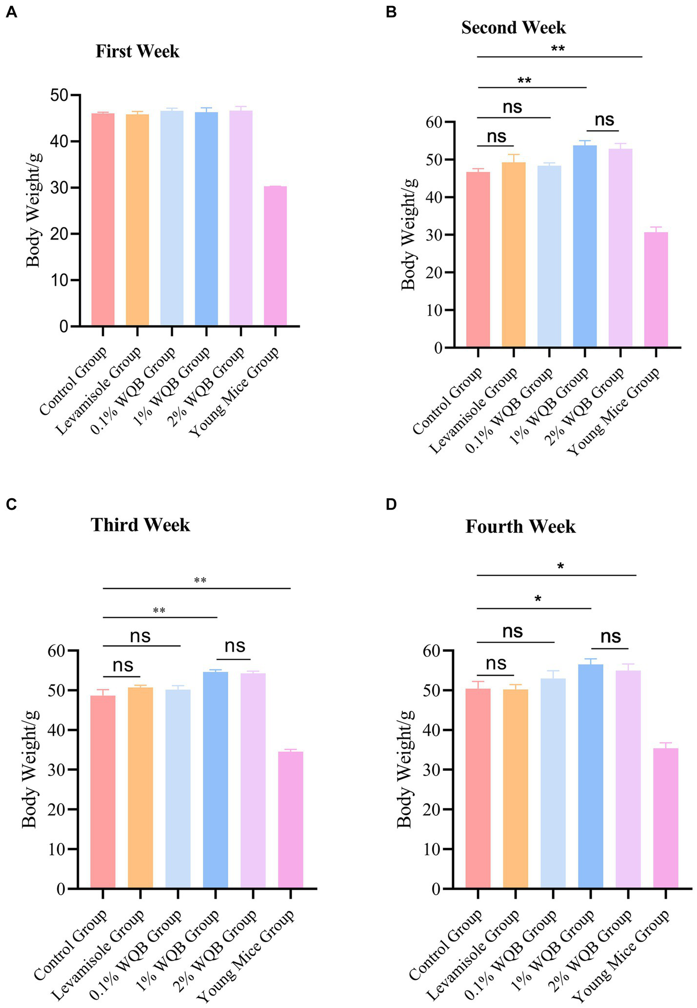 The body weight of mice in each group. (A) First week. (B) Second week. (C) Third week. (D) Fourth week. ns, not significant; *p < 0.05; **p < 0.01.