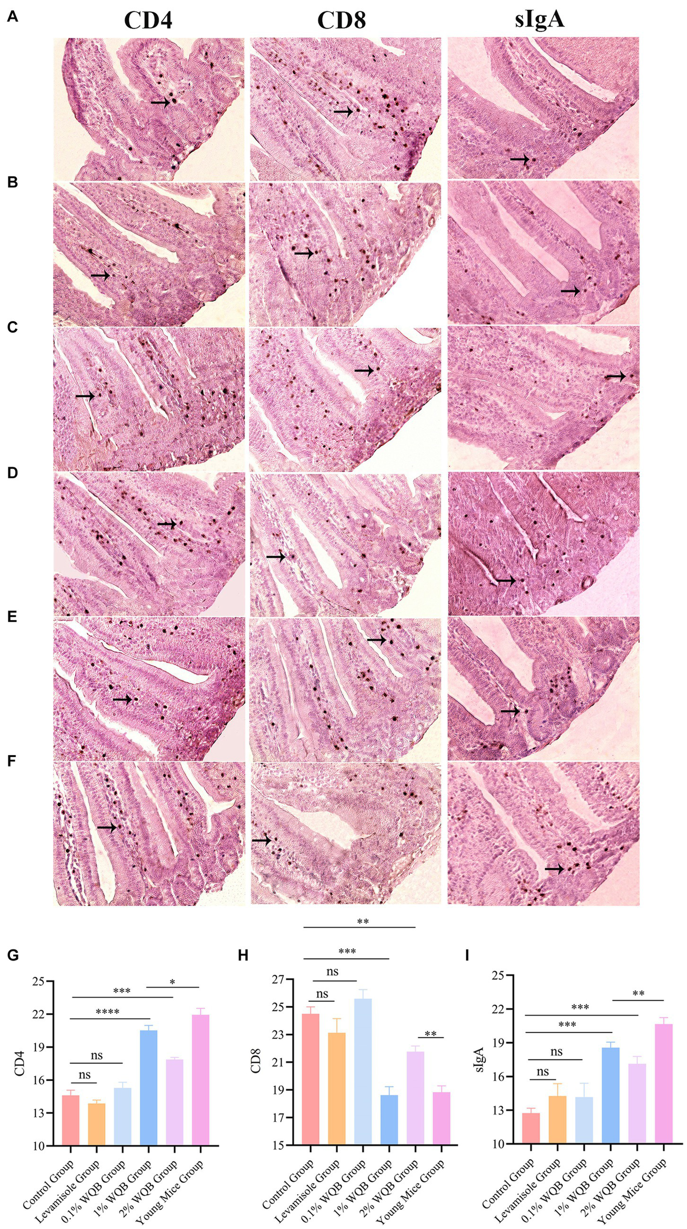 IHC analysis of mice intestinal mucosa. Cells expressing CD4, CD8 and sIgA proteins were indicated by arrows. (A) Control group. (B) Levamisole group. (C) 0.1% WQB group. (D) 1% WQB group. (E) 2% WQB group. (F) Young mice group. (G) Expression levels of CD4. (H) Expression levels of CD8. (I) Expression levels of sIgA. ns, not significant; *p < 0.05; **p < 0.01; ***p < 0.001; ****p < 0.0001.