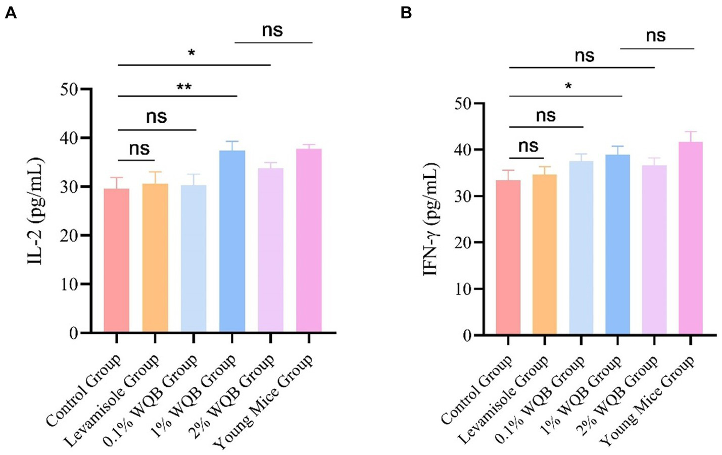 Treatment with 1 and 2% WQB increased the expression of IL-2 (p < 0.05, p < 0.01). However, there was no significant contrast between the group of young mice group and the group administered with 1% WQB (p > 0.05) (Figure 6A). Meanwhile, mice subjected to 1% WQB displayed heightened levels of IFN-γ in contrast to those in the control cohort (Figure 6B).