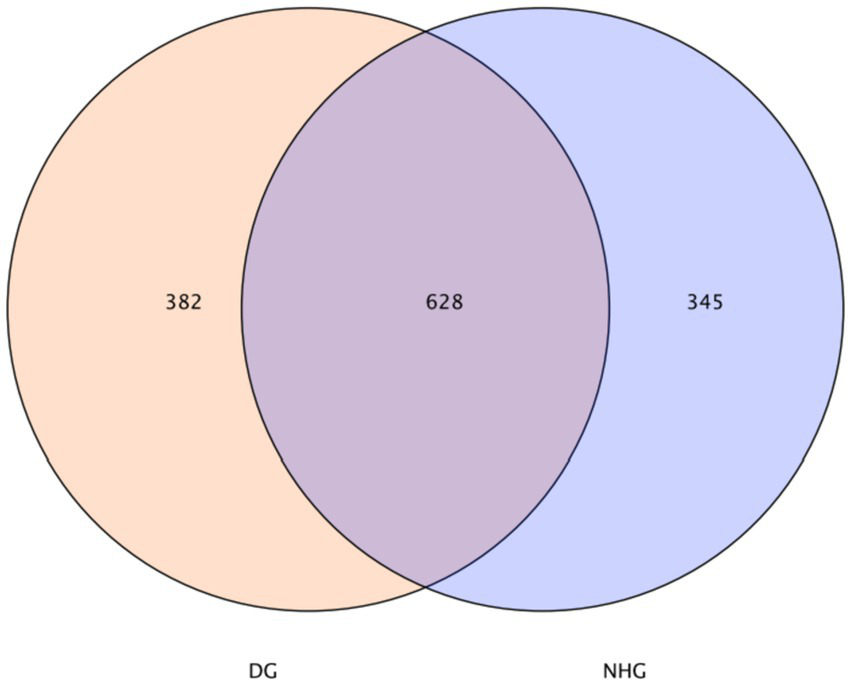 In this study, common and unique features among samples (applicable to samples 2–5) were visualised using a Venn diagram, from which common microbes among groups could be identified depending on common features. The rumen had 628 OTUs, 382 unique OTUs in the DG group, and 345 unique OTUs in the hybrid group (NHG) (Figure 2).