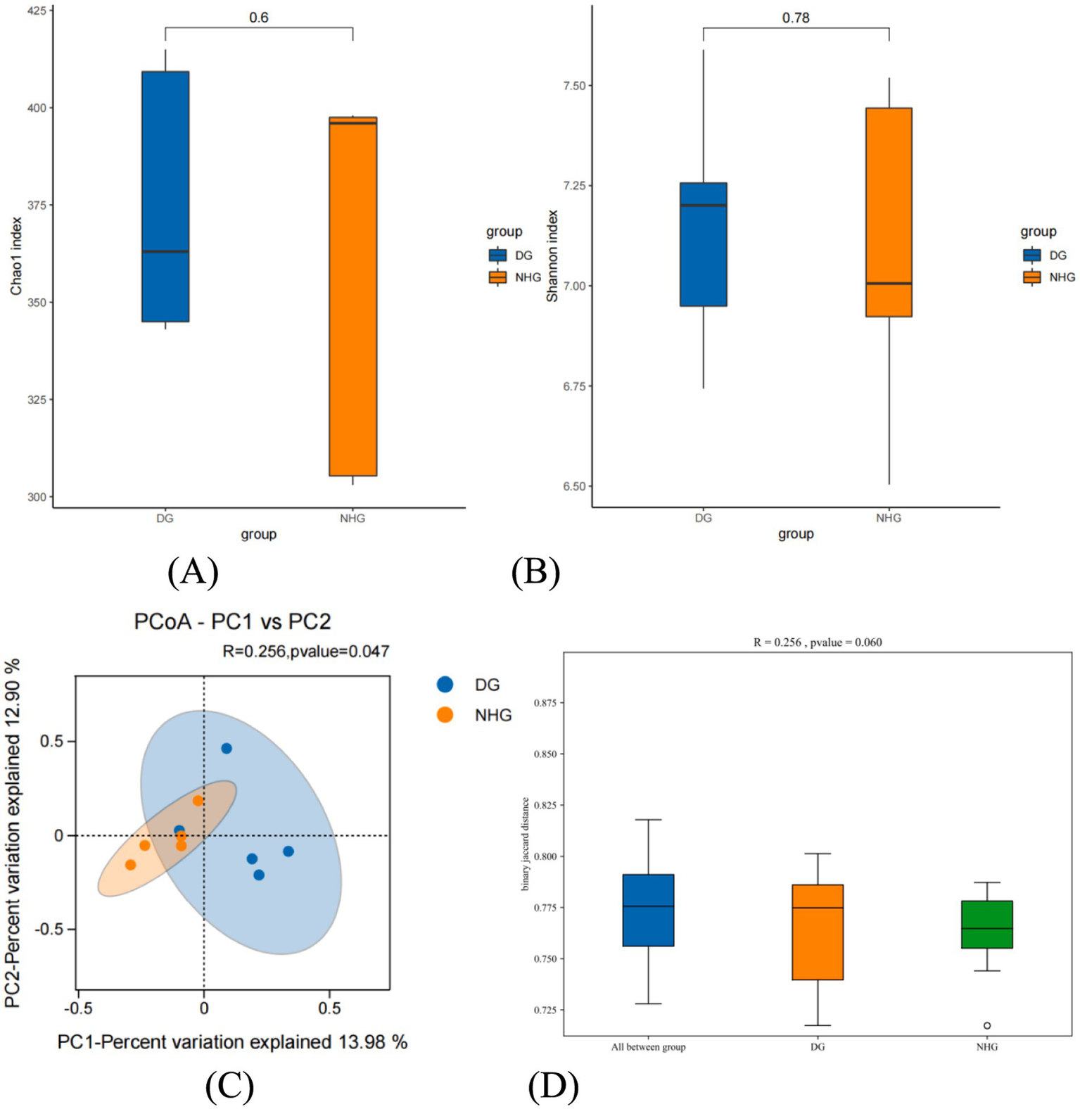 Figure 3. The different on microbial diversity and structure. DG, Dong goat; NHG, Nubian hybrid after cross. (A) The richness of rumen microbiota. (B) The diversity of rumen microbiota. (C) The principal coordinate analysis (PCoA) based on the bacterial binary_jaccard in each sample. (D) Analysis of Similarities (ANOSIM).