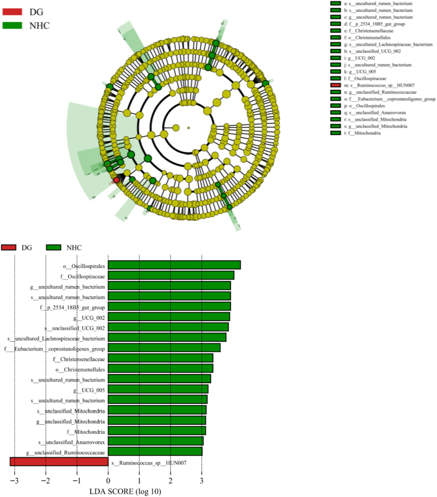 To identify the featured microbiota at the LDA = 4 level using LDA and LEfSe, the microbial composition differed between the two groups (Figure 5). In this way, we found biomarkers with statistical differences between the two groups and the evolutionary clade of the LDA distribution (Figure 5), which showed significant differences between groups in the microorganisms. The relative abundance of only one rumen species in the NHG group was significantly lower than that of the DG group, while the relative abundance of 2 orders, 5 family, 5 genus and 7 species was significantly higher than that of the DG group.
