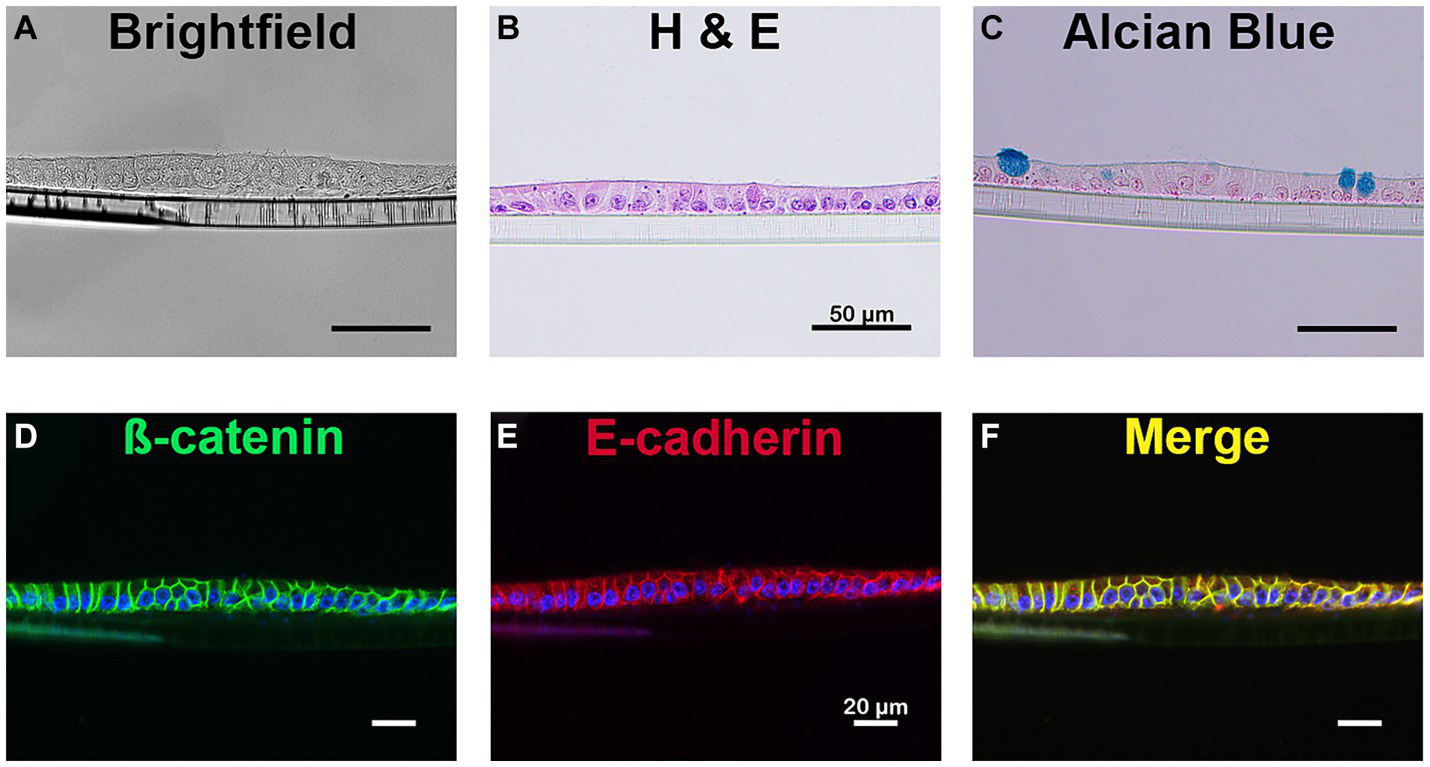 Conditioned media was removed from transwell plates followed by gentle washing of each transmembrane well with 37°C PBS three times. Subsequently monolayers were incubated in 10% formalin at room temperature (RT) overnight followed by storage at RT in 70% ethanol for histology. Fixed cell cultures were paraffin embedded and cut in 4–8 μm sections onto glass slides. For histology, sections were stained using hematoxylin and eosin (H&E) and alcian blue (mucin).