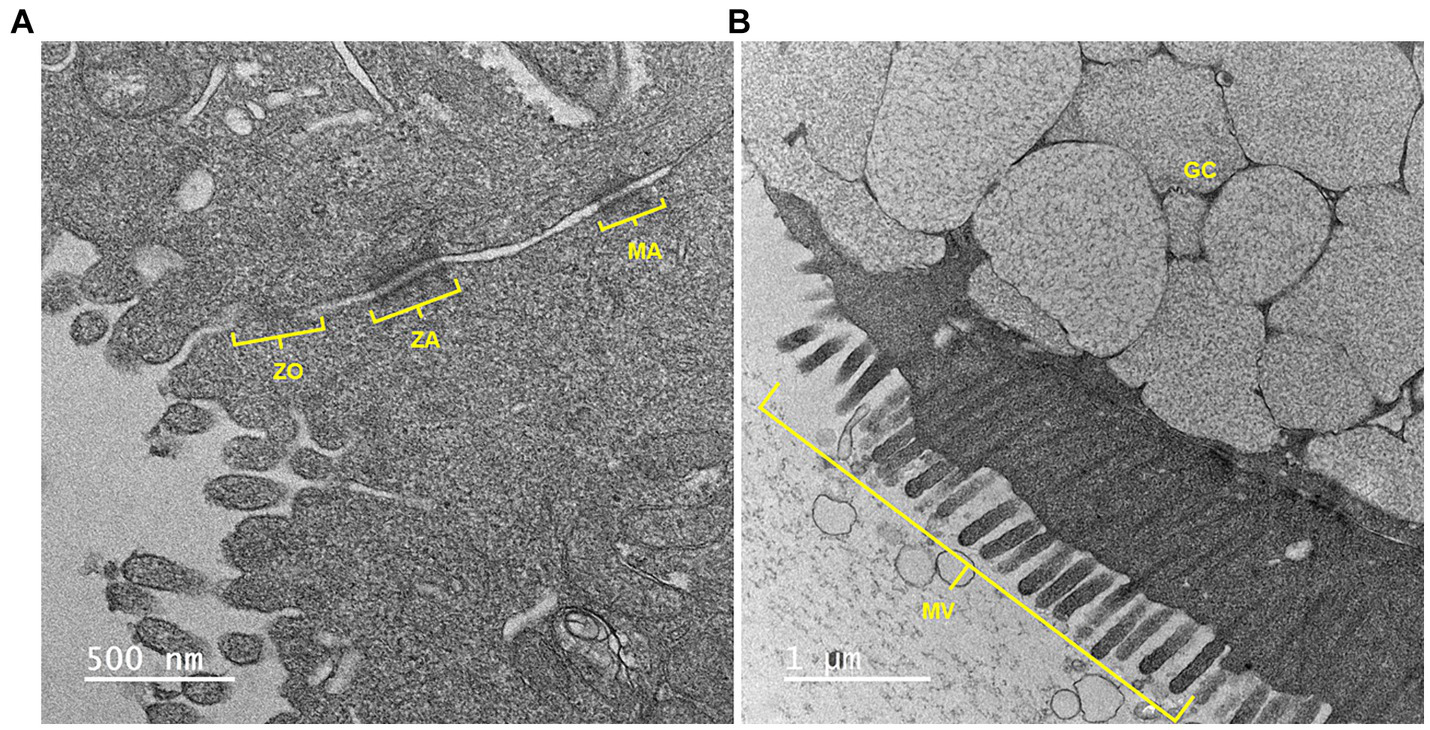 The equine jejunal monolayers were subjected to fixation for 48 h at 4°C in 0.1 M sodium cacodylate buffer (pH 7.2) containing 1% paraformaldehyde and 3% glutaraldehyde, before being processed for transmission electron microscopy (TEM). Following three washes with 0.1 M cacodylate buffer (pH 7.2), the monolayers were subsequently subjected to a post-fixation process which involved exposing the samples to 1% osmium tetroxide in 0.1 M sodium cacodylate buffer at RT for 1 h. Subsequently, the samples were washed with deionized water and subjected to staining using 2% uranyl acetate for 1 h. A series of dehydration steps were subsequently carried out, wherein monolayer samples were subjected to graded concentrations of ethanol (25, 50, 70, 85, 95, and 100%) for a duration of 1 h each. The samples then underwent further dehydration using pure acetone, with three successive changes, each lasting 15 min. Finally, samples were subjected to infiltration using EmBed 812 formula (hard) EPON epoxy resin (Electron Microscopy Sciences, Hatfield, PA). The infiltration process involved using graded ratios of resin to acetone (3:1, 1:1, 1:3, and pure resin), ensuring complete infiltration with pure epoxy resin, with each step lasting between 6 to 12 h. The tissue samples were carefully inserted into BEEM embedding capsules and subjected to polymerization at 70°C for 48 h. Using a Leica UC6 ultramicrotome (Leica Microsystems, Buffalo Grove, IL), 1.5 μm semi-thin sections were obtained and stained with EMS Epoxy stain (composed of toluidine blue-O and basic fuchsin). Thin sections (50 nm thickness) were prepared and collected onto single-slot carbon film grids, and TEM images were acquired using a 200 kV JEOL JSM 2100 scanning transmission electron microscope (Japan Electron Optics Laboratories, Peabody, MA) with a GATAN OneView 4 k × 4 k camera (Gatan Inc., Pleasanton, CA).