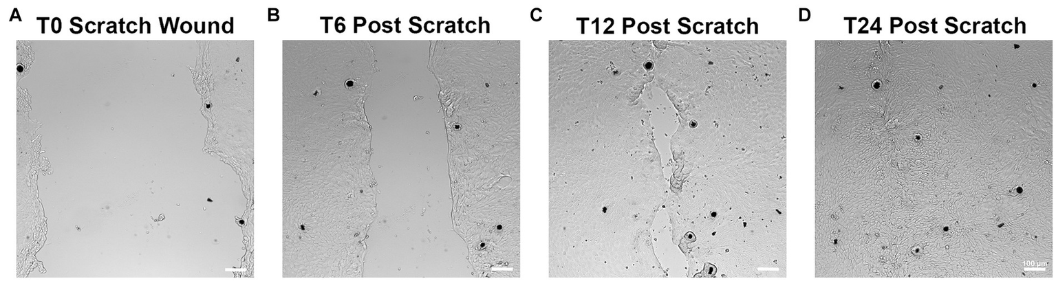 To assess epithelial restitution and cell migration, a scratch-wound assay was performed (26). Briefly, once the epithelial monolayers (subcultured, plated and incubated as described in section 2.3.1) had reached 100% confluence, a 200 μL pipette tip was used to scratch a wound evenly through the center of each well. Wells were then washed with PBS and fresh media applied. Scratched monolayers were subsequently monitored and imaged every 6 h to track cell migration.