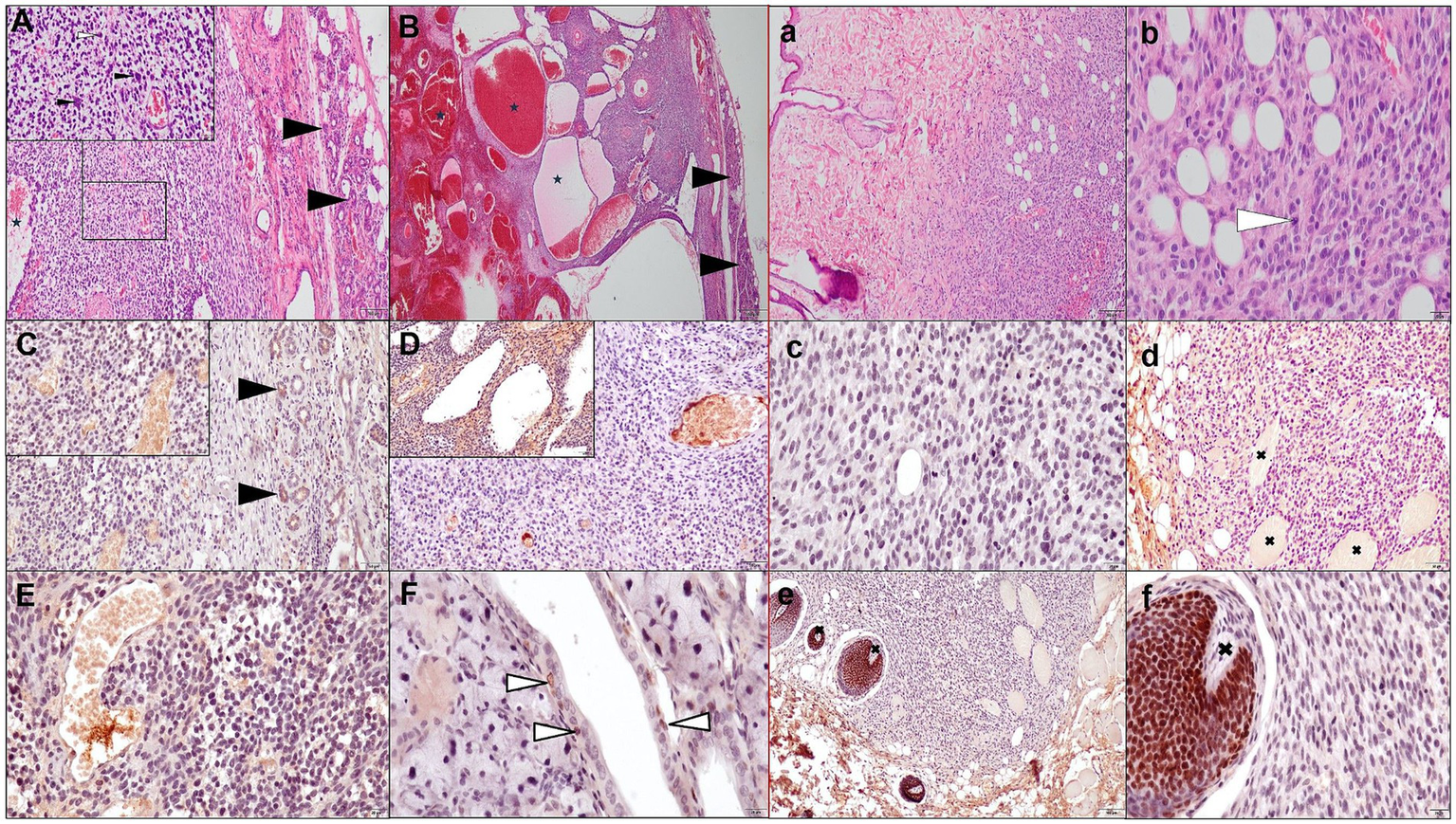 Histopathological image (hematoxylin-eosin-HE staining) and immunohistochemical (IHC) study of a poorly differentiated sarcoma located adjacent to the left mandibular salivary gland (A,B,C–F) and in the surrounding skin (a,b,c–f) being a recurrence. (A,B) Show a poorly demarcated, non-encapsulated tumor-rich cell neoplasm located near the salivary gland (black arrowhead) with loosely arranged neoplastic cells with indistinct cell borders, forming cystic vessel-like spaces filled to varying degrees with erythrocytes and eosinophilic fluid (asterisk). A pleomorphic tumor cells (oval, round, polygonal shape) with high anisokaryosis, a sparse cytoplasm, multinucleated cells present (inset: black thin arrowhead), and mitotic figures (white arrowhead) up to 4 in 10 HPF fields of view (2.37 mm2),; sparse pale connective tissue with areas of hemorrhage. Immunohistochemical examination confirmed the mesenchymal origin of the neoplastic cells: negative cytoplasmic reaction for pan-cytokeratin (C, arrowheads indicate CK-positive salivary epithelial cells); weakly positive cytoplasmic reaction for vimentin, although it was negative in some areas (D); no nuclear reaction for p63 protein in tumor cells (E). Nuclear p63 reaction in salivary myoepithelial cells is indicated by white arrowheads (F). (a,b) Show a poorly demarcated, non-encapsulated tumor-rich cell neoplasm arranged in short interlacing streams, located in the dermis and subcutaneous tissue, infiltrating muscle fibers and hair papillae (marked with a black shout in d–f). Pleomorphic tumor cells (oval, spindle, round, polygonal shape) with high anisokaryosis, visible 1–2 nucleoli, moderate slightly eosinophilic cytoplasm. Numerous mitotic figures (19/10HPF, [2.37 mm2]) one of them indicated by a white arrowhead (b). The stroma is scanty with areas of hemorrhage, but less extensive compared to the poorly differentiated sarcoma adjacent to the salivary gland. As in the sample of poorly differentiated sarcoma adjacent to the salivary gland, CK-negative (c), Vim-positive to negative (d), and p63-negative (e,f) neoplastic cells are shown. Hair matrix cells show nuclear positivity toward p63 (e,f).