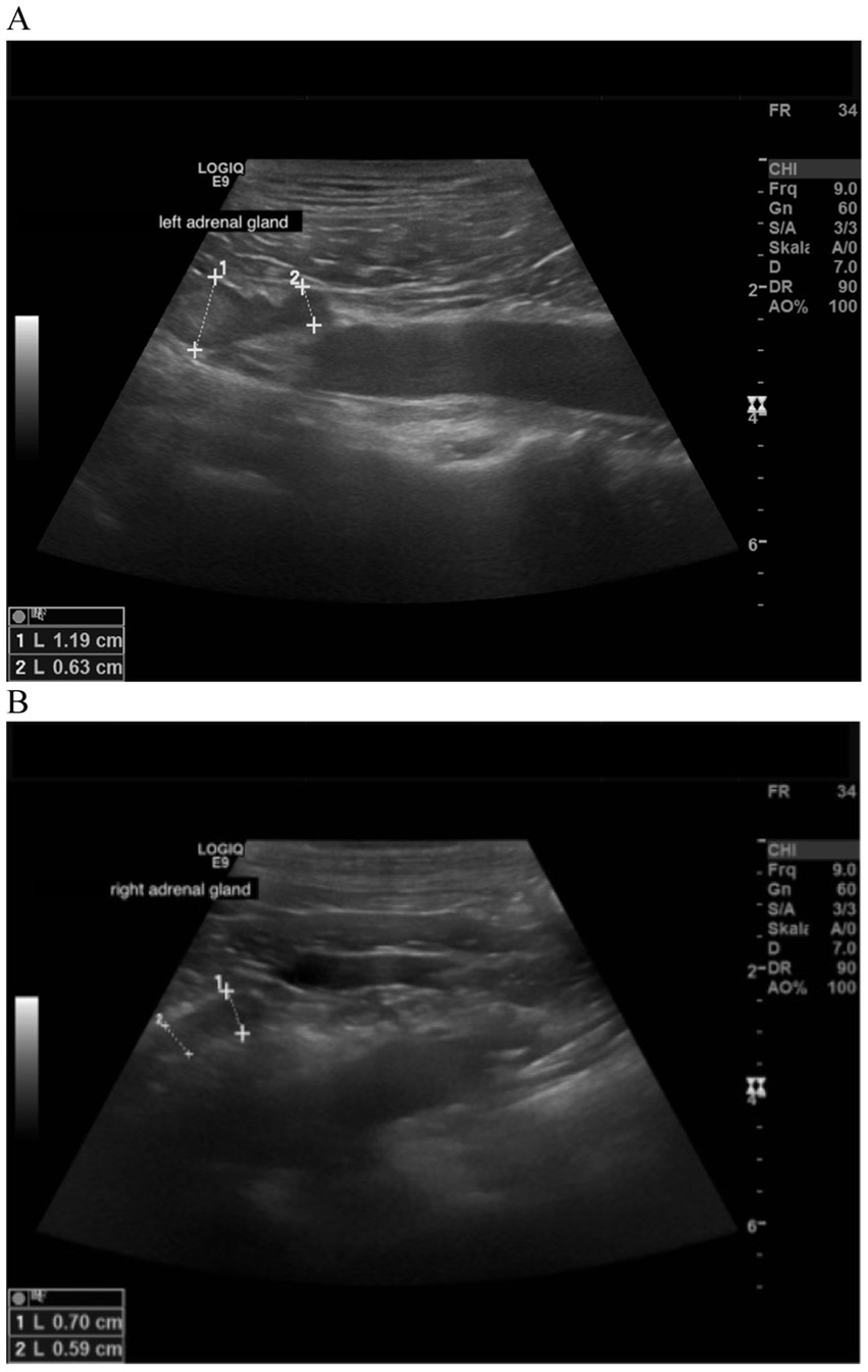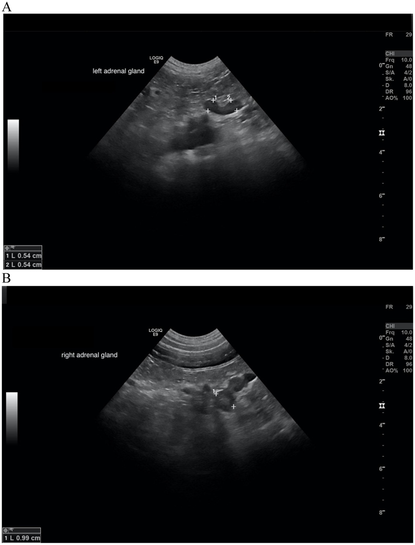 Figure 6. Ultrasound images of the left and right adrenal gland in a dog with adrenal asymmetry. (A) Cranial and caudal pole of the left adrenal gland measured both 0.54 cm in width. (B) cranial and caudal pole of the right adrenal gland measured 0.99 and 0.74 cm in width. In this dog, no reevaluation of the adrenal glands was performed. MRI had revealed a pituitary macrotumor.