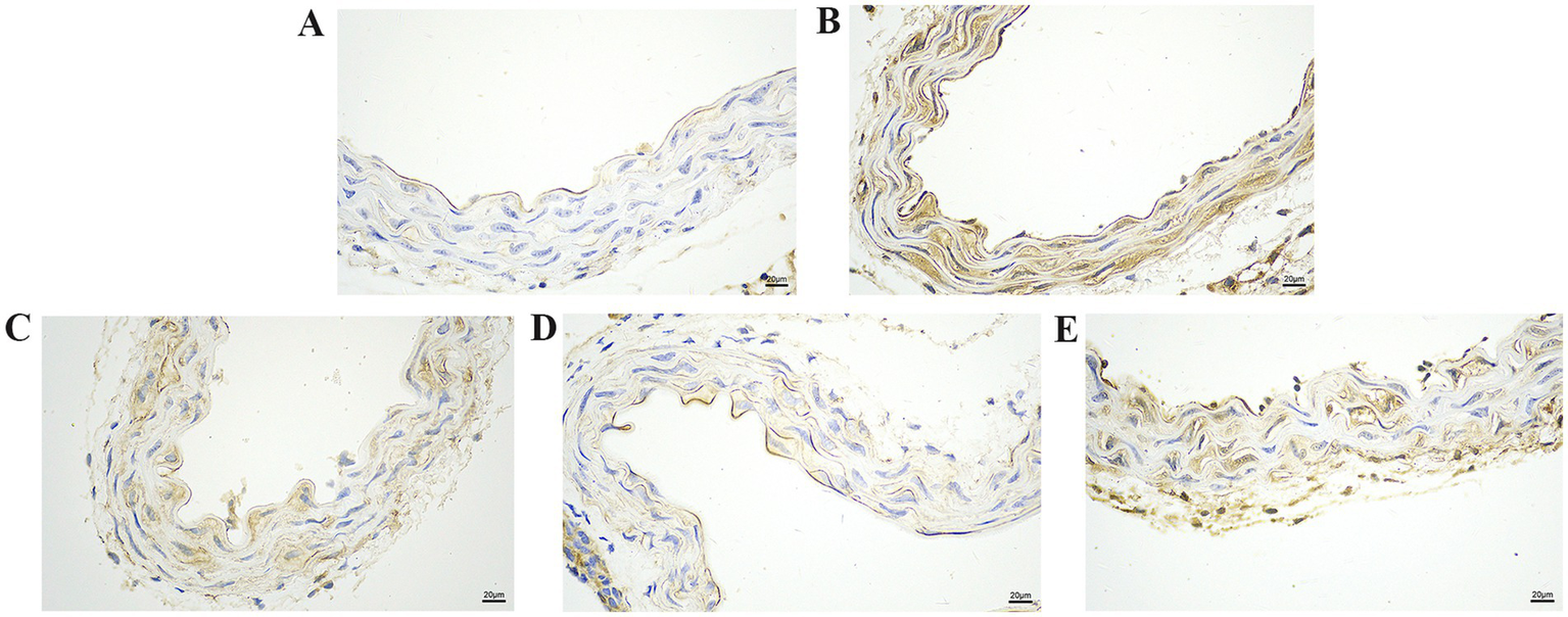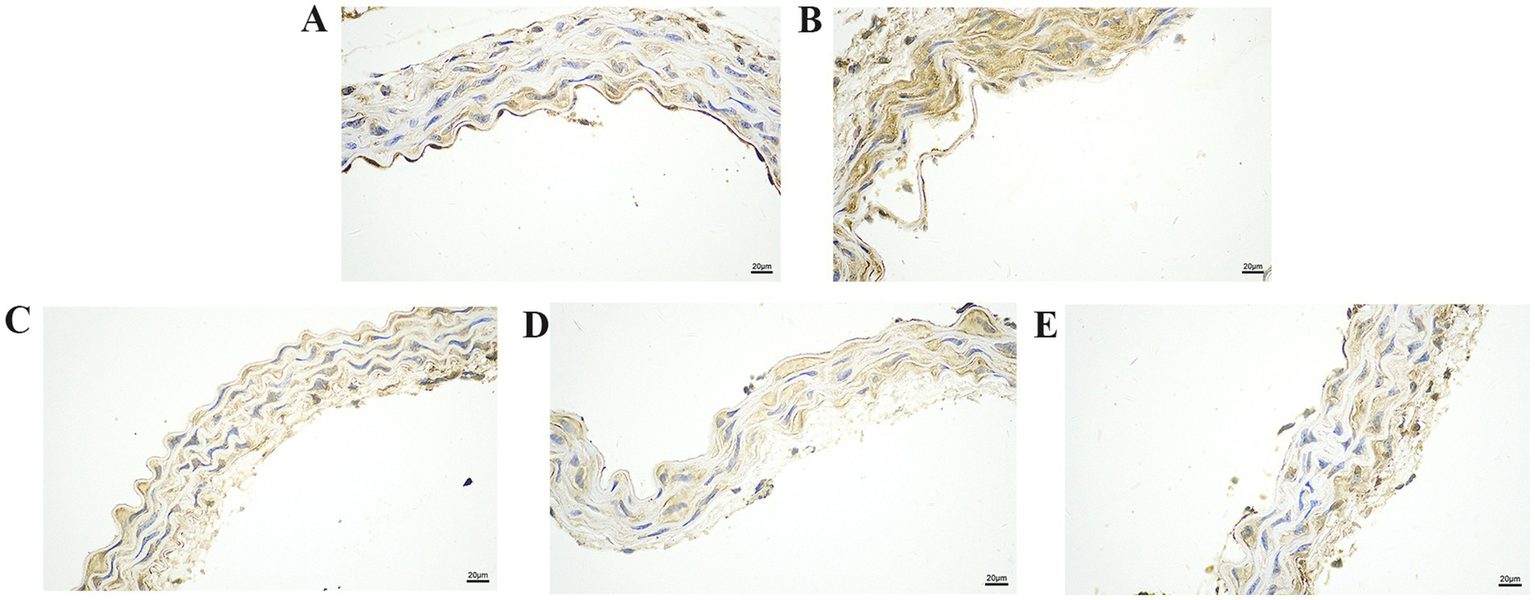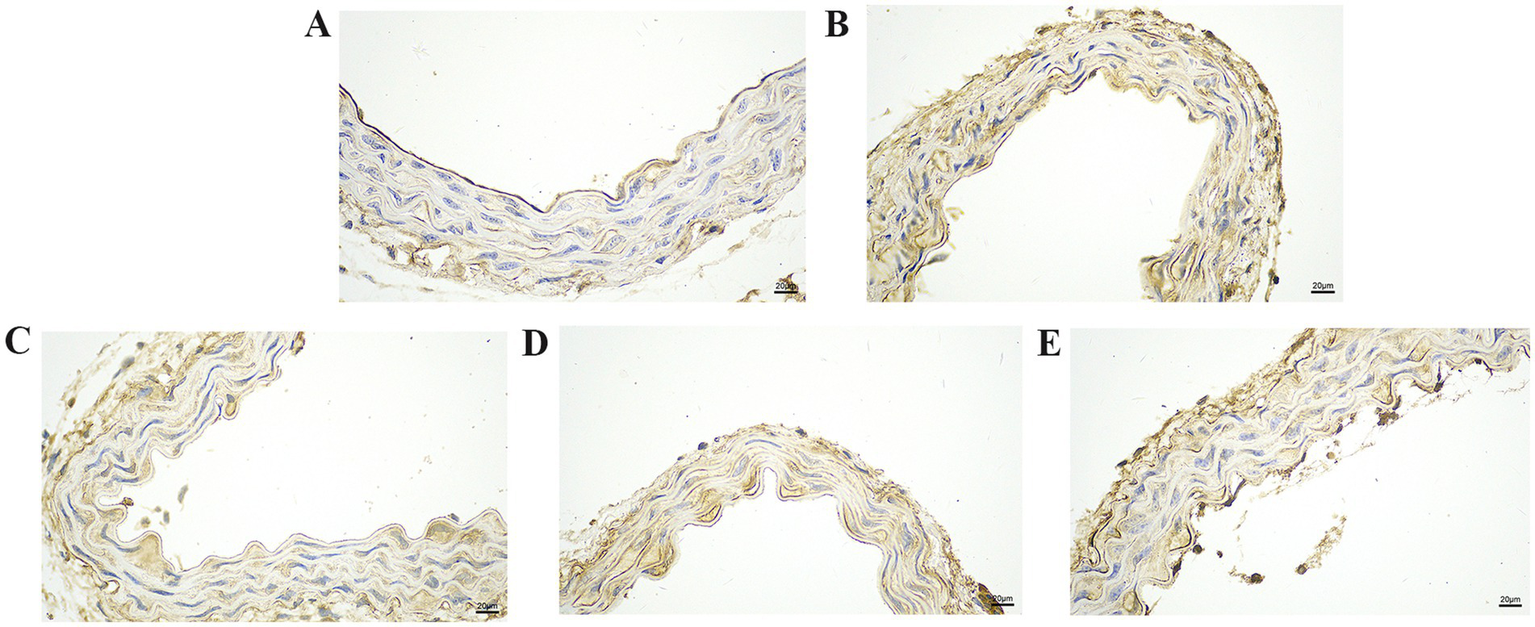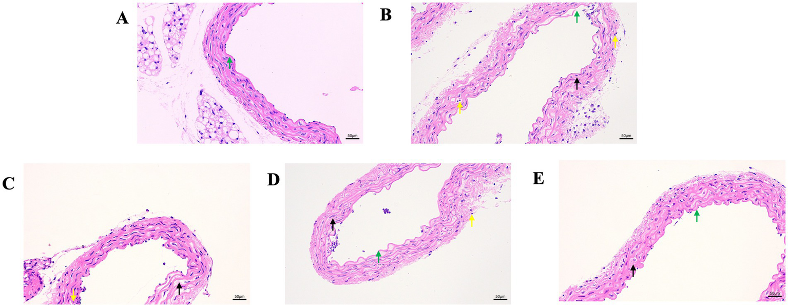 After collecting vascular tissue samples from the mice, they were fixed in 4% neutral buffered paraformaldehyde (Servicebio, China), dehydrated through a graded alcohol series, embedded in paraffin wax, and cut into 5-μm sections. The sections were stained with a haematoxylin and eosin staining kit (Baiqiandu, China), and the histopathological changes in the vascular tissues were examined using a microscope with and an imaging system (NIKON, Japan).
