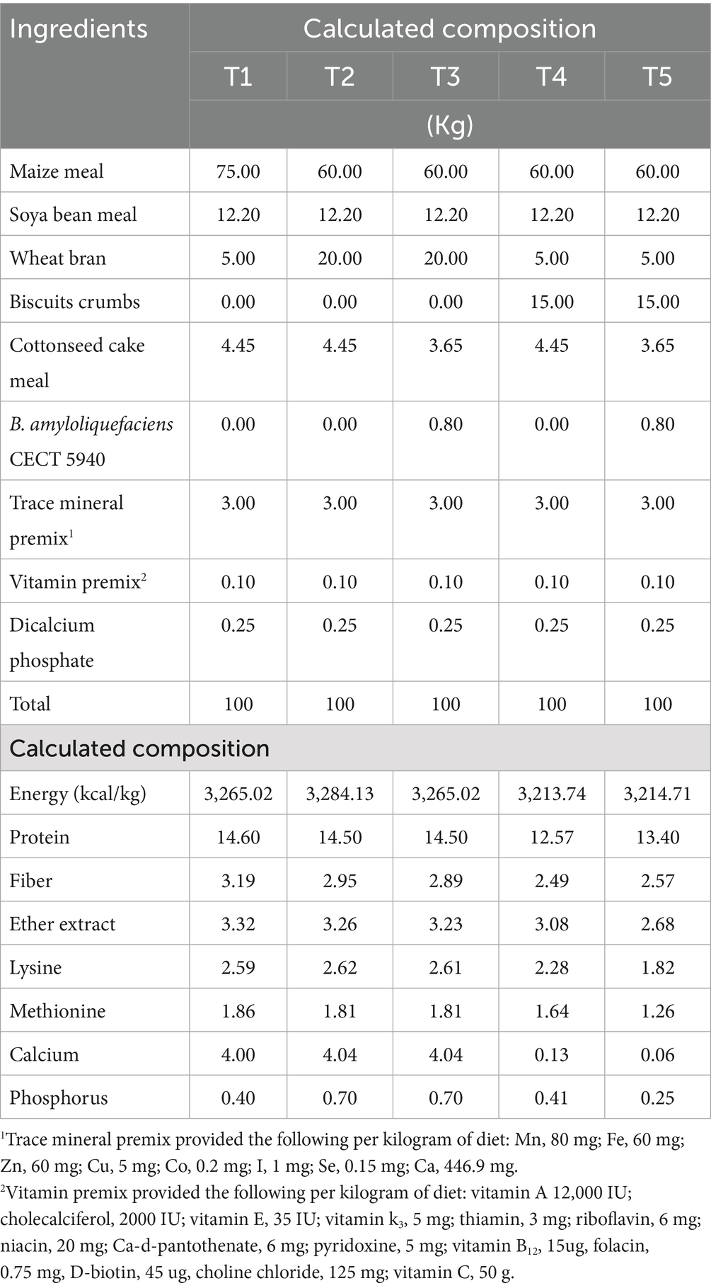 WB, with an annual global production of around 150 million tons, is a major milling industry by-product rich in protein, starch, lipids, minerals, and minor components such as organic acids and phenolic compounds (2). Although cheaper than maize, WB’s application in monogastric feed is limited by its high fiber and low energy content. However, its nutritional limitations can be addressed through dietary supplementation with probiotics like Bacillus amyloliquefaciens CECT 5940, which improve nutrient digestibility and gut health. Similarly, BC derived from surplus or broken biscuits is rich in digestible carbohydrates and energy, and contains moderate amounts of protein (8–10%), fats, and sugars. It is palatable, enhances feed intake, and supports circular economy practices by reducing food waste (4). Prior research has shown that partial replacement of maize with WB or BC can maintain or improve productivity indicators. For instance, Ahmad et al. (3) found that the partial replacement of maize with WB in layer diets led to comparable egg production rates and improved feed conversion ratios. In another study, the inclusion of BC in broiler diets was shown to enhance weight gain and feed efficiency (5). However, the use of such alternative feedstuffs often presents nutritional limitations such as the high fiber content of WB and the relatively low protein content of BC which can impair nutrient absorption and overall performance. To overcome these drawbacks, dietary supplementation with probiotics has gained attention. Previous studies have shown that including probiotics, can enhance nutrient utilization and offset the anti-nutritional effects of unconventional feed ingredients. For instance, Zang et al. (43) and Azzam et al. (6) demonstrated that supplementing high-fiber or low-quality diets with B. amyloliquefaciens improved growth performance, gut morphology, and nutrient digestibility in poultry. Similarly, Teng et al. (7) and Abou-Elkhair et al. (44) reported enhanced performance and gut health in layers fed non-conventional diets with added probiotics. These findings justify the inclusion of B. amyloliquefaciens in this study, particularly in diets incorporating WB or BC.