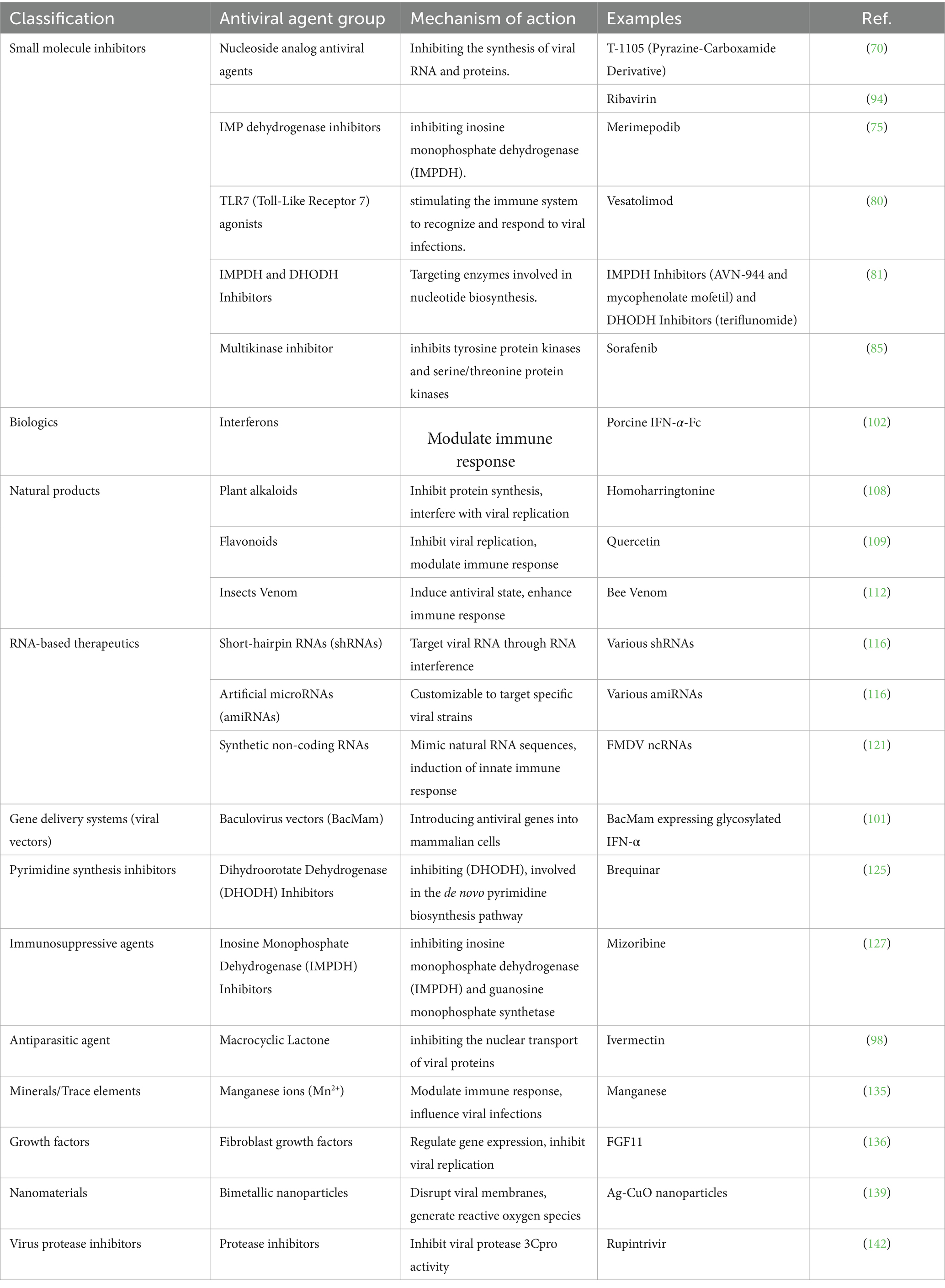 Inosine monophosphate dehydrogenase (IMPDH) and dihydroorotate dehydrogenase (DHODH) are essential enzymes that play crucial roles in the de novo synthesis of purines and pyrimidines, respectively. Inhibitors of IMPDH and DHODH ultimately lead to depletion of guanine and uridine nucleotides of cells thereby inhibiting RNA and DNA synthesis. AVN-944 and mycophenolate mofetil target IMPDH, while teriflunomide targets DHODH. These enzymes are involved in nucleotide biosynthesis, and their inhibition disrupts viral replication. Mei-Jiao et al. (81) reported that IMPDH inhibitors (AVN-944 and mycophenolate mofetil) and the DHODH inhibitor (teriflunomide) effectively suppressed FMDV serotypes O and A in IBRS-2 cells in a dose- and serotype-dependent manner. The antiviral effects were most pronounced during the early stages of infection (0–8 h post-infection). Furthermore, treatment with AVN-944 and teriflunomide significantly increased the survival rates of FMDV-infected mice, demonstrating their broad-spectrum antiviral potential. However, concerns about toxicity and potential side effects due to interference with host cellular processes remain. Additionally, serotype-specific responses may limit their universal application. Future research should focus on optimizing dosages, assessing long-term safety, developing serotype-targeted therapies, and exploring combination treatments to enhance their antiviral efficacy.