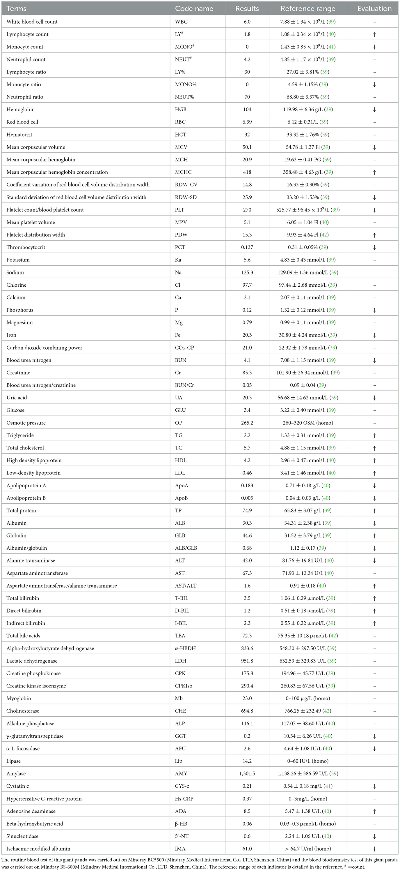 39. Li L, Jingchao L, Li L, Wenjun H, Lihui L, Xin C, et al. Hematologic and biochemical reference of captive giant pandas based on non-stress sampling methods. Chin J Wildlife. (2017) 38:7.