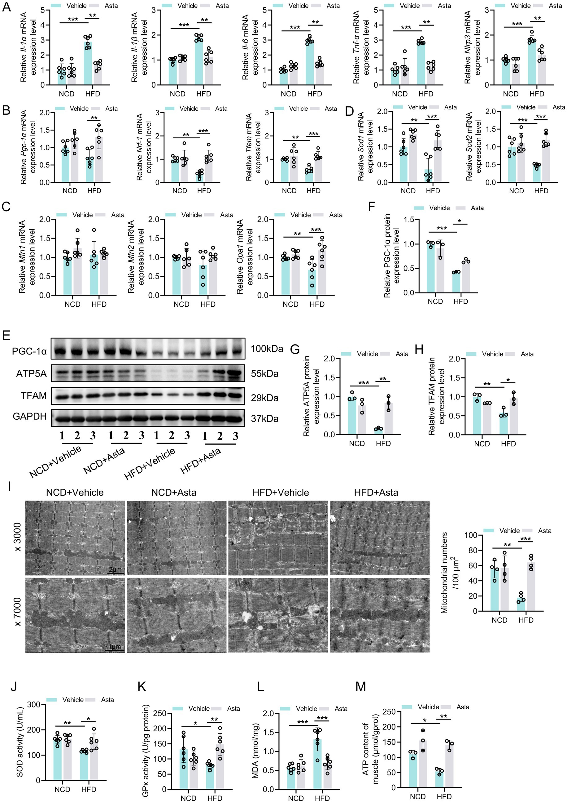 Figure 2. Astaxanthin (Asta) alleviates HFD-induced oxidative stress and mitochondrial biogenesis in skeletal muscles. (A) The expression levels of Il-1α, Il-1β, Il-6, Tnf-α, and Nlrp3 genes (n = 6). (B,C) The expression levels of Pgc-1α, Nrf1, Tfam, Mfn1, Mfn2, and Opa1 genes (n = 6). (D) The expression of Sod1 and Sod2 (n = 6). (E–H) Representative blot images and quantitative analysis of PGC-1α, TFAM, and ATP5A proteins (n = 3). (I) Representative transmission electron microscopy images of mitochondrial morphology (× 3,000, × 7,000) in skeletal muscle and quantitative analysis of mitochondrial numbers (n = 4). (J,K) SOD and GPx activity (n = 6). (L) Quantitative analysis of MDA levels (n = 6). (M) ATP content in skeletal muscles (n = 3). Data are shown as mean ± standard deviation (SD). Statistical analysis among four groups was performed using two-way ANOVA with a Sidak post hoc test. * p < 0.05, ** p < 0.01, and *** p < 0.001.