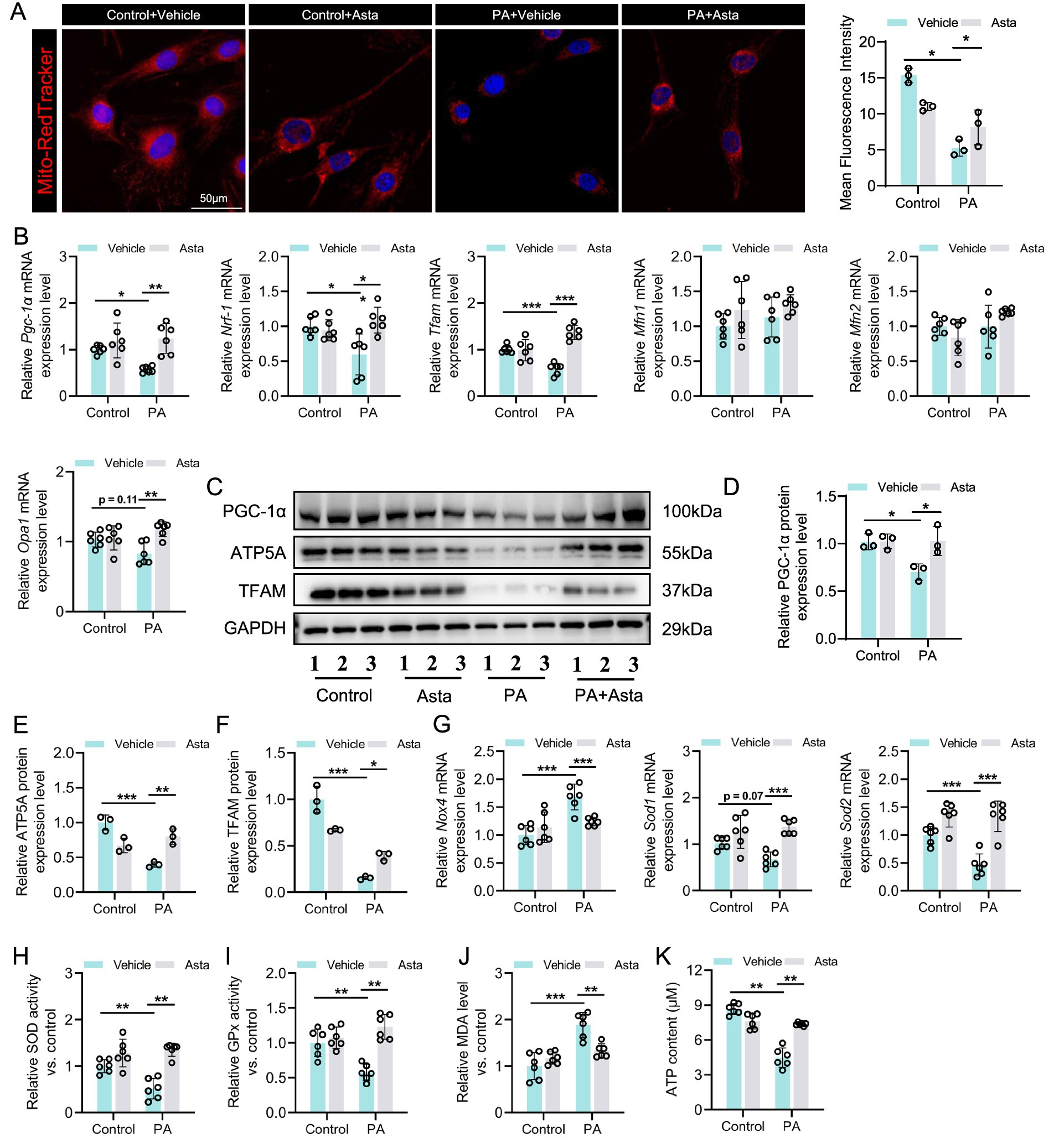 Figure 4. Astaxanthin (Asta) mitigates mitochondrial damage and reduces oxidative stress in palmitate (PA)-exposed C2C12 cells. (A) Mito-Tracker staining in C2C12 cells and quantitative analysis (n = 3). (B) The expression levels of Pgc-1α, Nrf1, Tfam, Mfn1, Mfn2, and Opa1 genes (n = 6). (C–F) Representative blot images and quantitative analysis of PGC-1α, TFAM, and ATP5A proteins (n = 3). (G) The expression of Sod1, Sod2, and Nox4 (n = 6). (H,I) SOD and GPx activity (n = 6). (J) Quantitative analysis of MDA levels (n = 6). (K) ATP content in skeletal muscle (n = 6). Data are shown as mean ± standard deviation (SD). Statistical analysis among four groups was performed using two-way ANOVA with a Sidak post hoc test. * p < 0.05, ** p < 0.01, and *** p < 0.001.