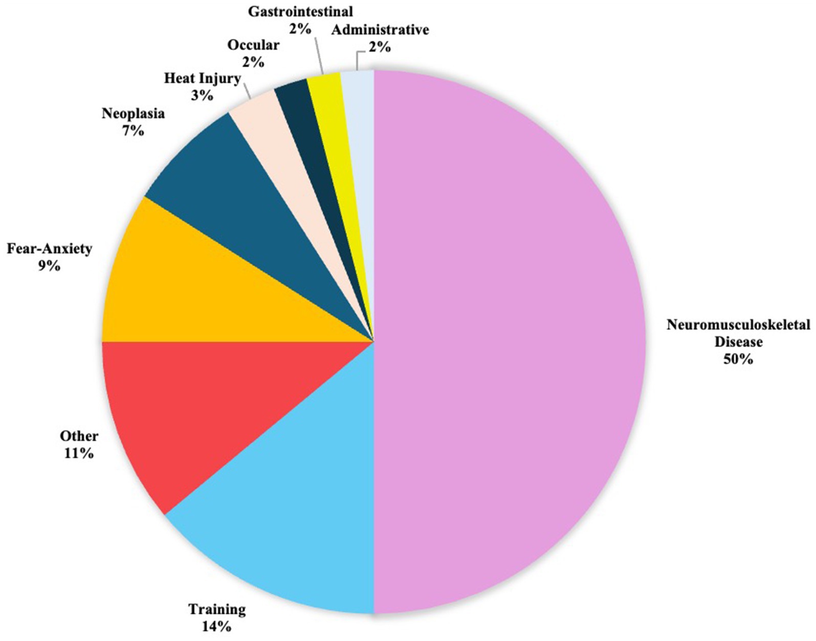 Chi square analysis revealed a highly significant difference in proportions by service discharge category (p < 0.0001). Follow up analysis used a Bonferroni adjusted alpha of 0.003. The most common service discharge categories were neuromusculoskeletal disease, training, fear-anxiety, neoplasia, and heat injury. The service discharge category with the highest frequency, neuromusculoskeletal disease, was significantly different than all other categories (p < 0.003). Frequency of training was significantly different from all other categories (p < 0.003). Fear-anxiety frequency was not significantly different from the frequency of neoplasia (p = 0.0378) but was significantly different from all other categories (p < 0.003). Similarly, neoplasia frequency was significantly different than other categories, excluding fear-anxiety (p < 0.003). Heat injury frequency was not significantly different from the frequencies of administrative (p = 0.2007), gastrointestinal disease (p = 0.2007), and ophthalmologic disease (p = 0.2922). However, the frequency of heat injury was significantly different from the other categories (p < 0.003). Therefore, these top five categories account for significant proportions of the discharge causes caused when compared to all other categories (Figure 1). Cumulatively, these five most prominent categories account for 83.50% of all the service discharge occurrences in the studied population. Frequencies of each category can be found in Table 1.