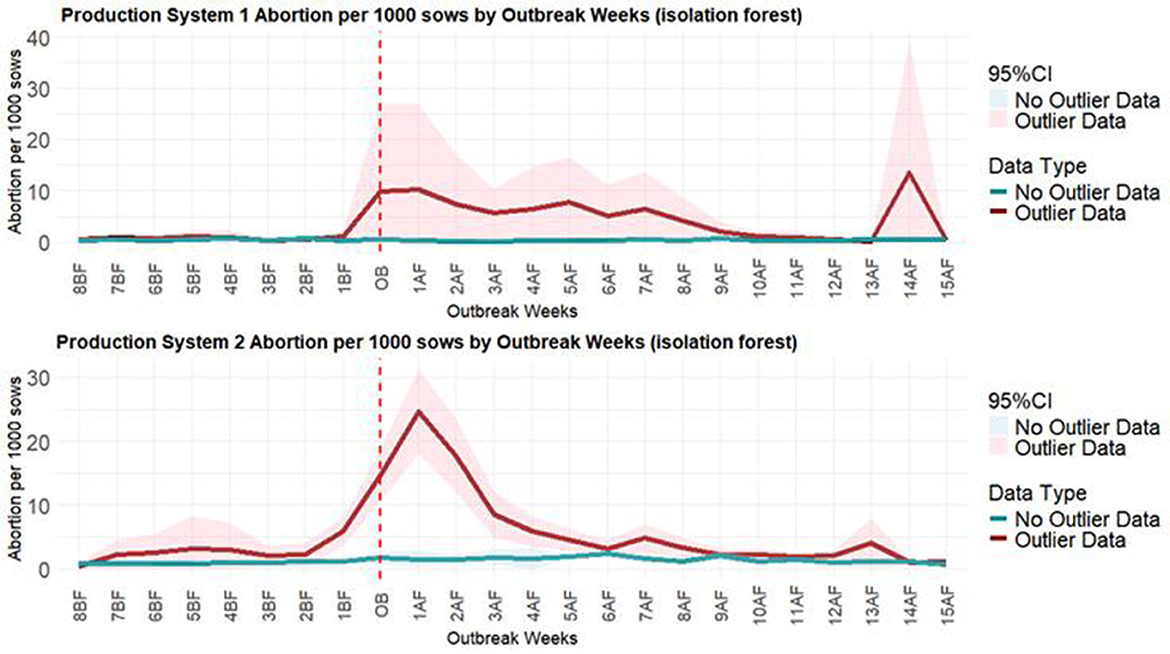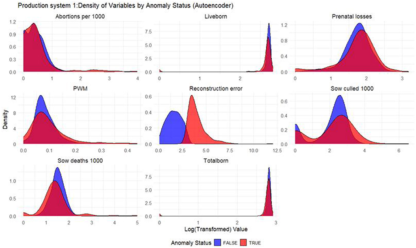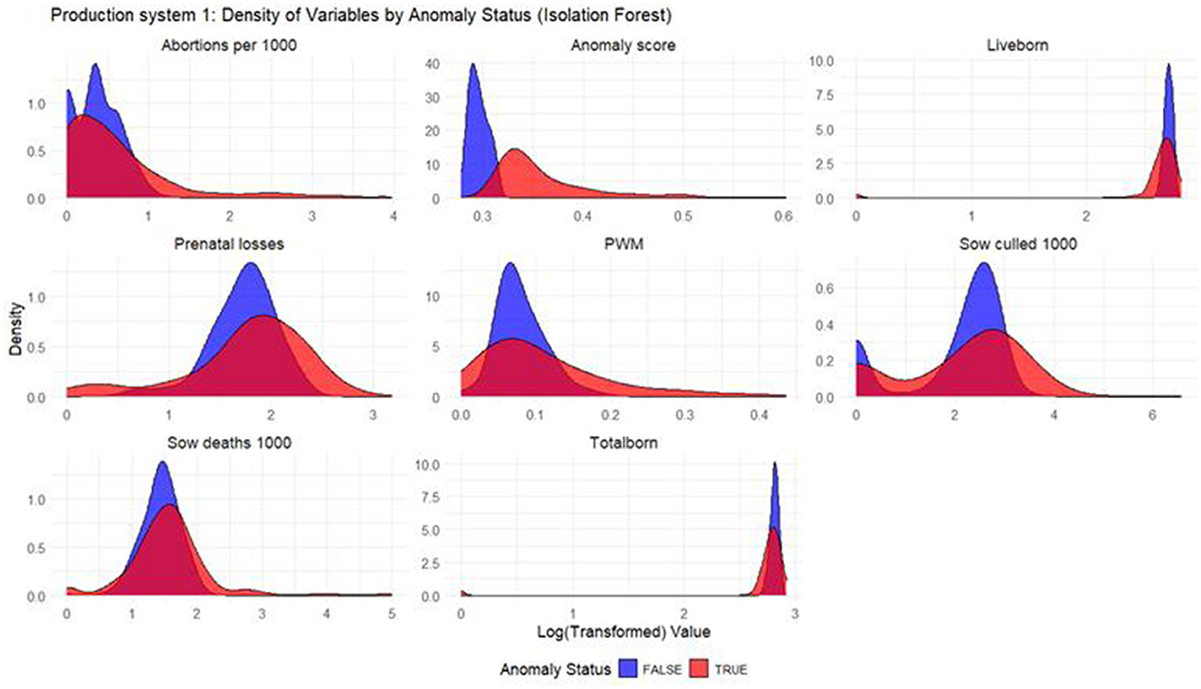 Anomalies are data points that deviate from values expected under a given model or contextual distribution. Such deviations may arise from measurement errors, atypical operating conditions, or previously unknown processes affecting the system (7). In the swine industry, an anomaly refers to an unexpected value in productivity indicators, which can arise for multiple reasons like animal management and husbandry, human error in data collection, environmental changes, and health-related factors. Numerous studies have demonstrated that syndromic surveillance is highly effective in detecting health-related events in swine breeding herds. For example, using statistical process control (SPC) charts to track productivity indicators has enabled the detection of deviations associated with PRRSV outbreaks early, often before routine diagnostic monitoring (8–10). These studies indicated that observing multiple productivity indicator patterns allows early detection of health challenges. Apart from these methods, anomaly detection also relies on methods such as time series (11, 12), supervised machine learning (13), and unsupervised learning (7, 14).