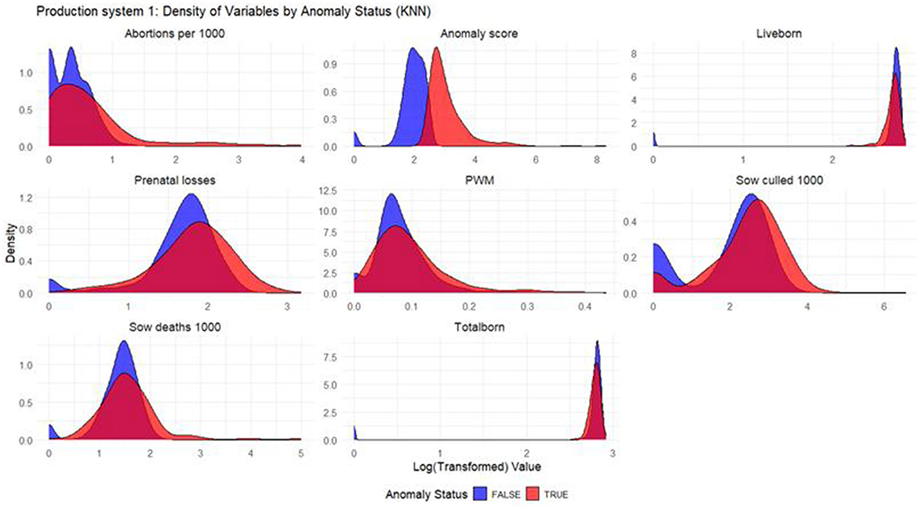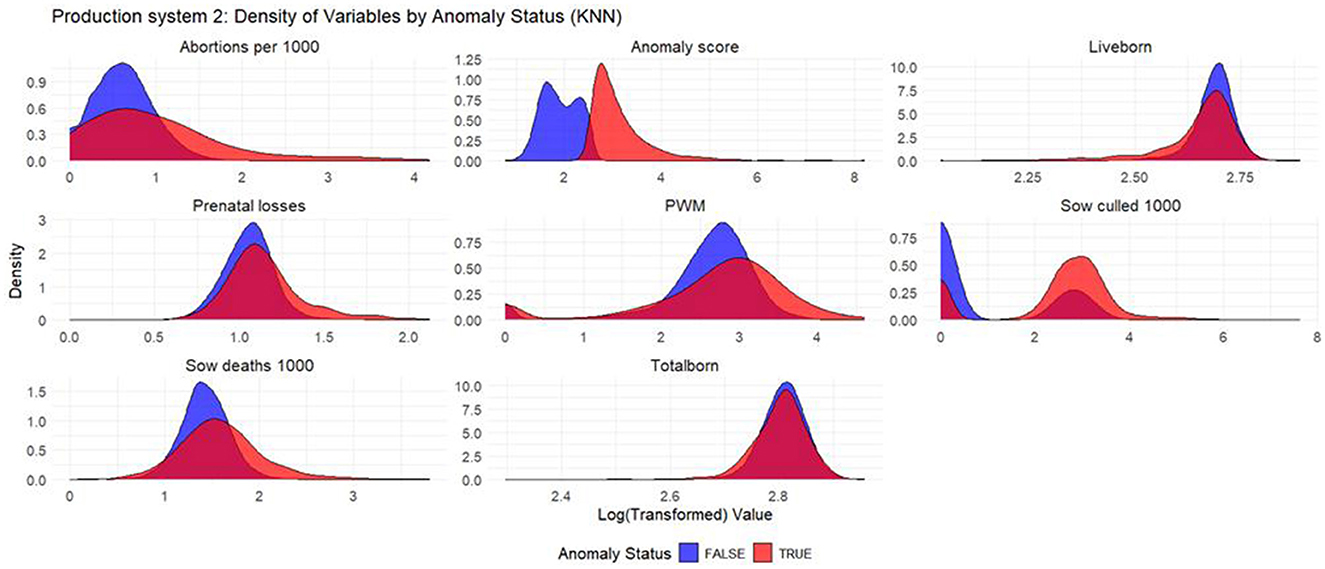 Based on the density plots for Isolation Forest (Figure 1), Autoencoders (Figure 2), and KNN (Figure 3), it can be concluded that, overall, productivity indicators such as abortions per 1,000 sows and sows culled per 1,000 sows during anomalous weeks (marked in red) tend to be higher than those in non-anomalous weeks (marked in blue). This is evident as the tails of the density curve for anomalous weeks stretch far to the right side of the plot for these productivity indicators, indicating higher values. In contrast, for liveborn and total born, the tails of the density curve for anomalous weeks reach far to the left, signifying lower values compared to non-anomalous weeks.