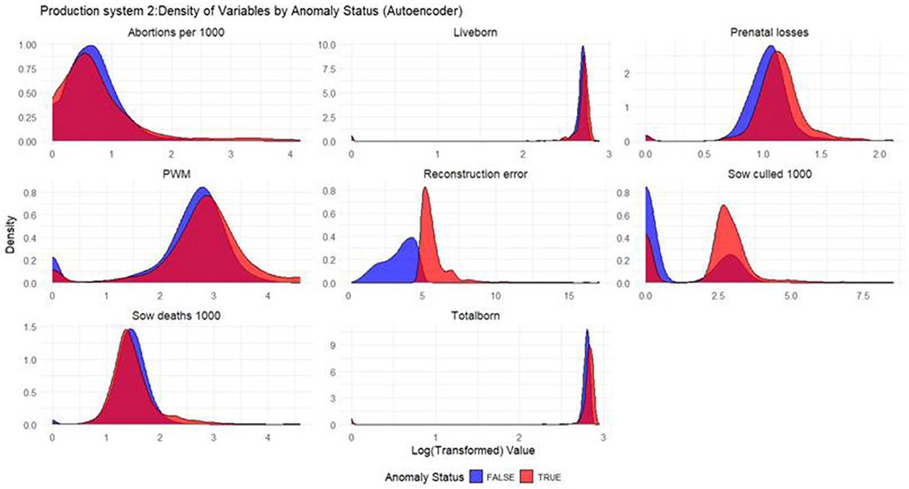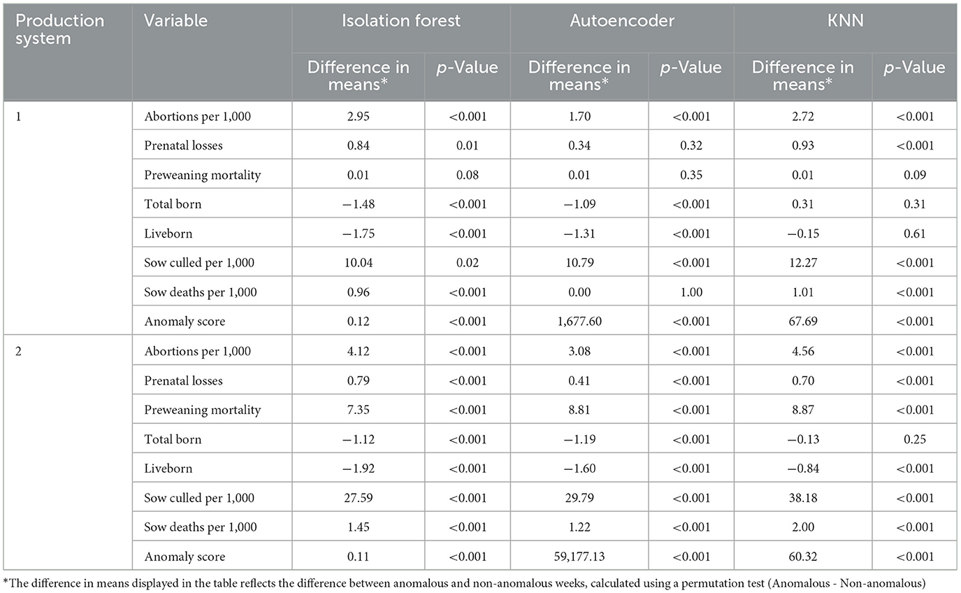 In Production System 1, the differences between anomalous and non-anomalous weeks across the three anomaly detection models (Isolation Forest, Autoencoder, and KNN) revealed that abortions per 1,000 sows had a significant increase in anomalous weeks (p-value <0.001) for all three models, with a difference in means ranging from 1.70 (Autoencoder) to 2.95 (Isolation Forest), suggesting that anomalous weeks are associated with a higher number of abortions. Prenatal losses also displayed significant differences, with Isolation Forest and KNN showing the largest effects (difference of 0.84 with p-value 0.01 and difference of 0.93 with p-value <0.001, respectively), indicating that anomalous weeks had increased prenatal losses. Conversely, total born and liveborn both showed negative differences in means (with Isolation Forest reporting a difference of −1.48 and a difference of −1.75 for total born and liveborn, with p-values <0.001, respectively), pointing to lower birth rates in anomalous weeks. The sows culled per 1,000 sows showed a higher difference for anomalous weeks (e.g., 12.27 with p-value <0.001 for KNN) than for non-anomalous weeks. Lastly, the anomaly scores revealed large differences (e.g., 1,677.60 for Autoencoder with p-value <0.001), emphasizing that weeks with anomalies exhibit a highly elevated anomaly score compared to non-anomalous weeks (Table 2).